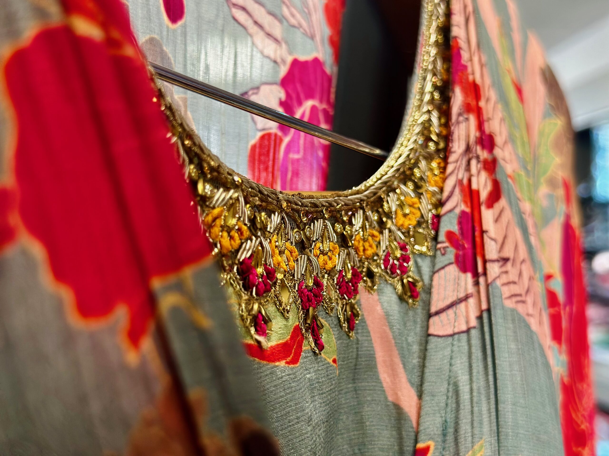 Step into the spotlight with this stunning grey and magenta printed gown designed to elevate your evening look.