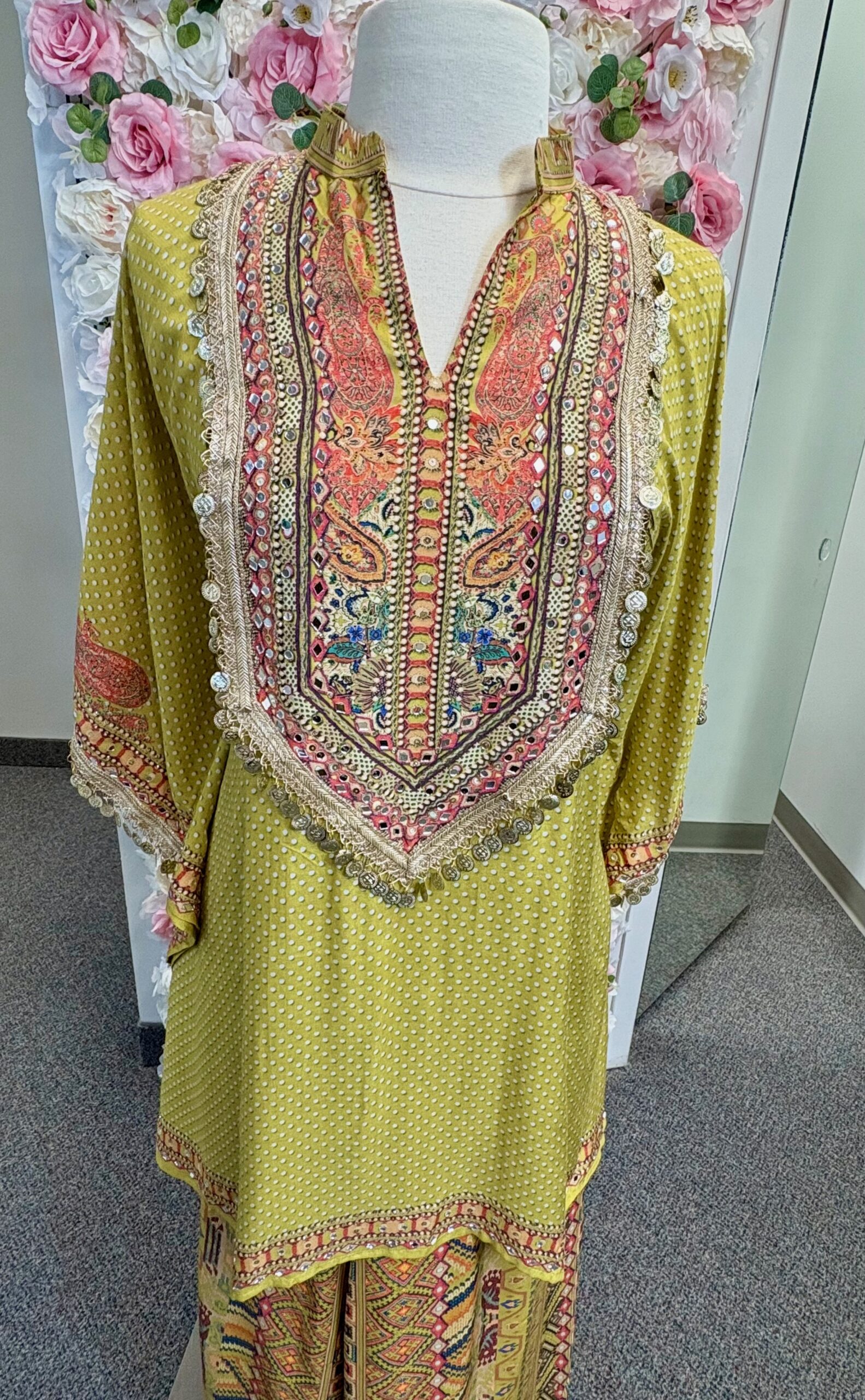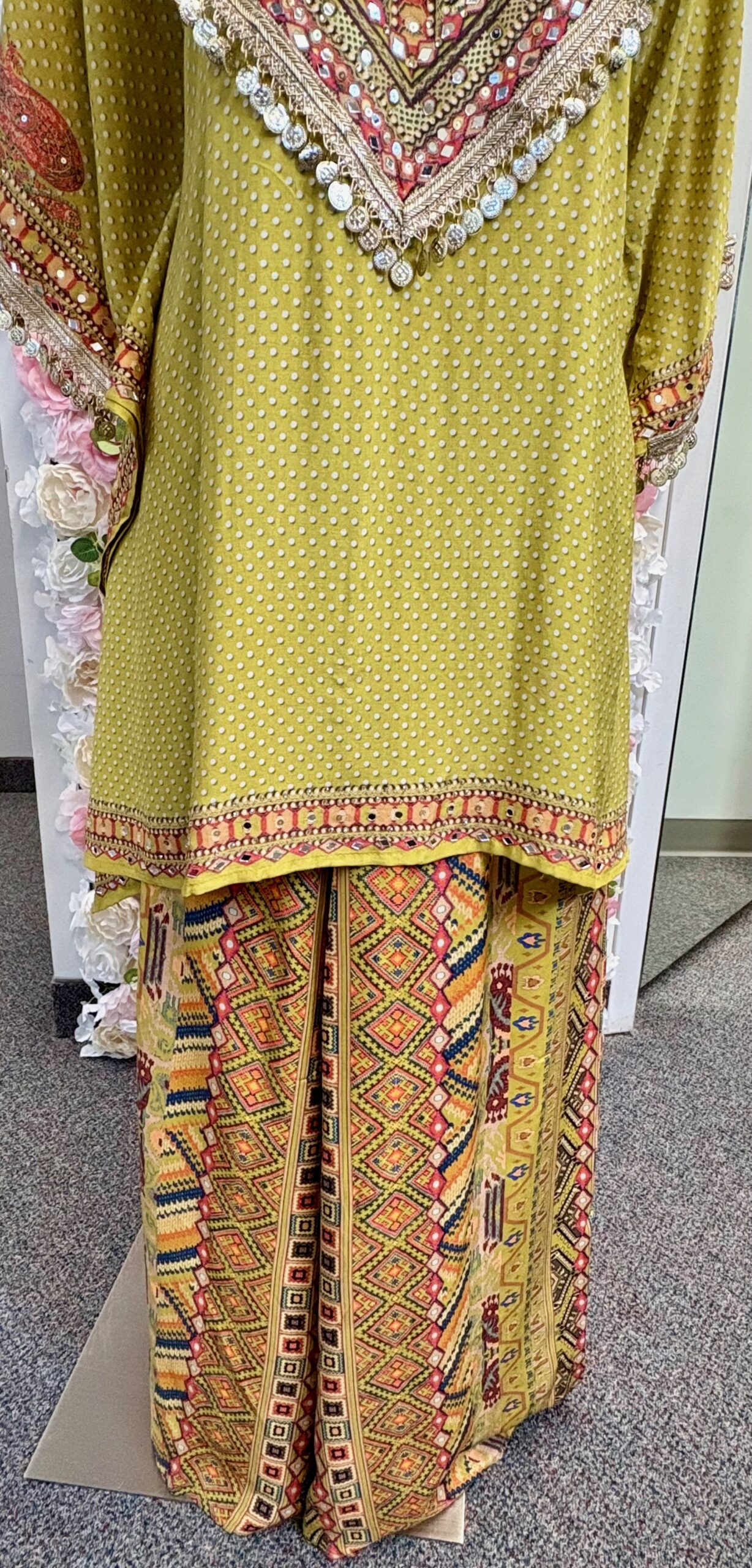 Set Includes: Printed kaftan with detailed mirror work and coordinating palazzo pants