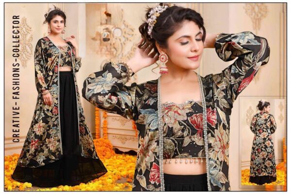 * Fabric & Print: Premium dark-base fabric adorned with a rich, oversized floral botanical print and shimmering silver border accents. 🌿