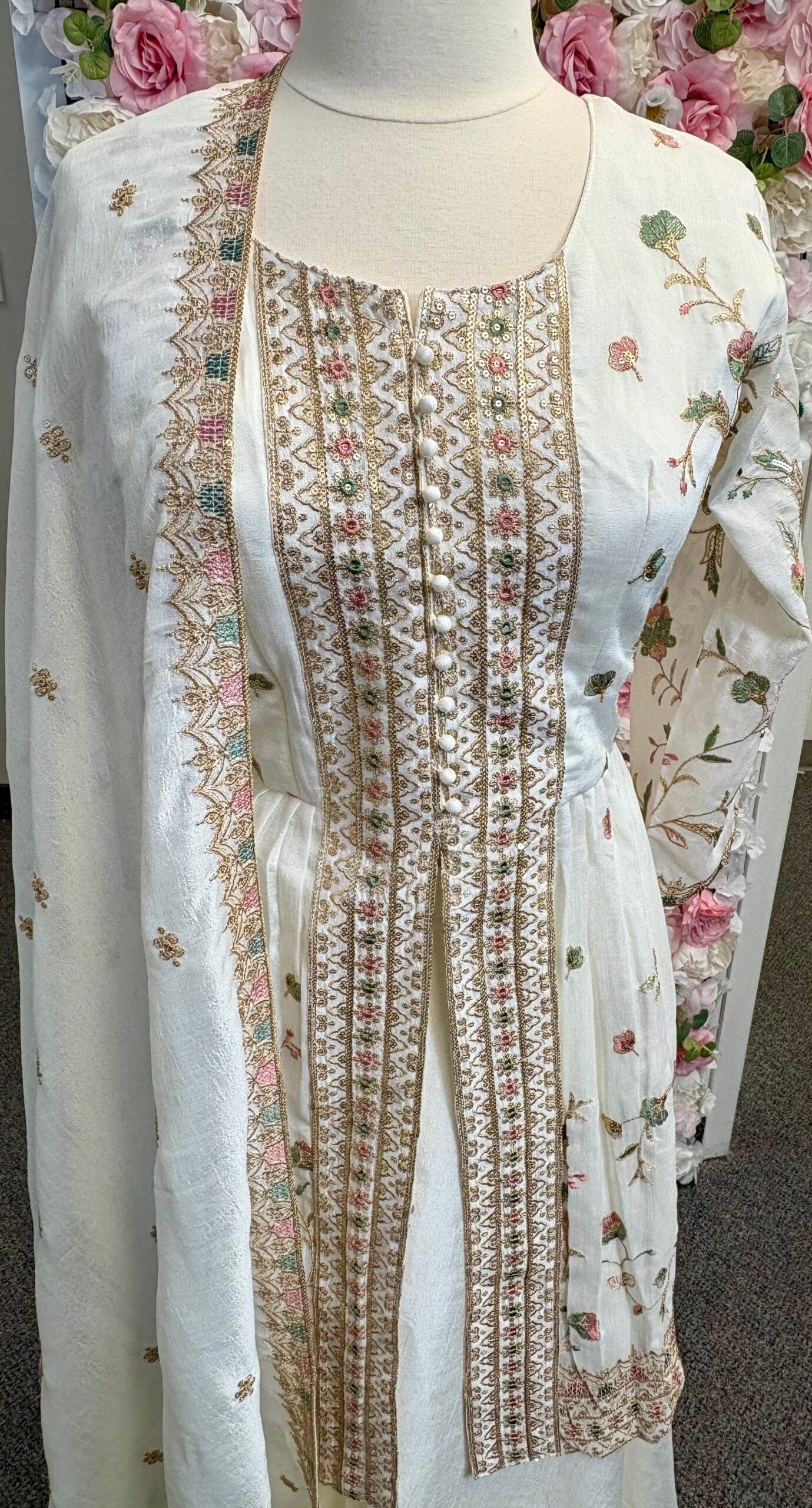 Fresh, festive, and effortlessly elegant — this 3-piece white palazzo set (Size 42) is a celebration of color and comfort. Crafted from soft, breathable fabric and beautifully accented with vibrant multicolor thread embroidery, it brings a perfect blend of traditional artistry and contemporary flair.
