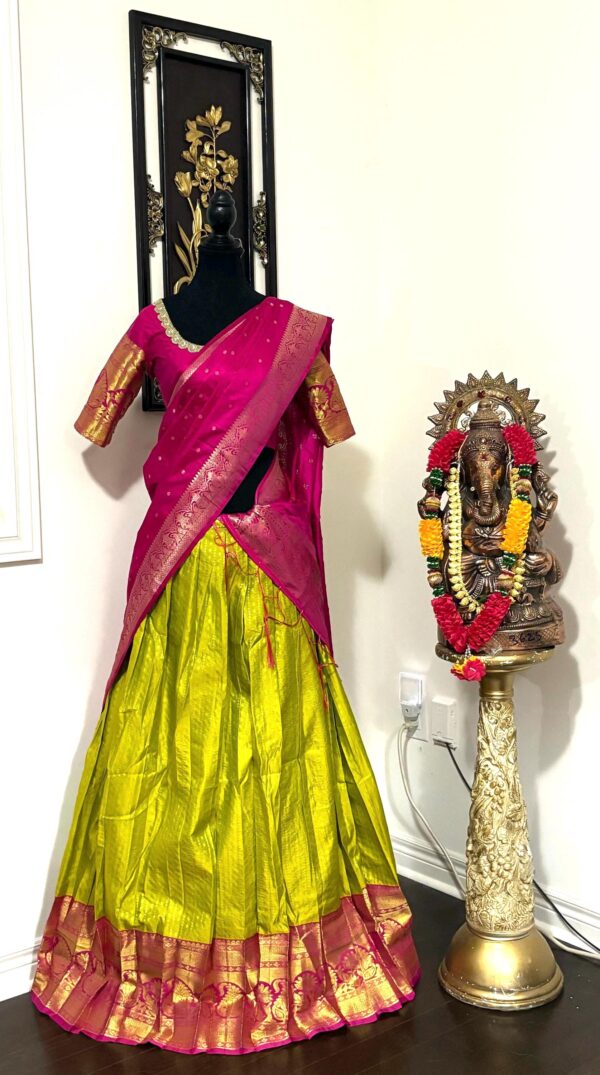 Exclusive soft quality Kanchi pattu / Kanjeevaram silk lehenga with Kanchi boarder rich Kanchi border paired with Banarasi dupatta and blouse and high quality soft lining for baby skin