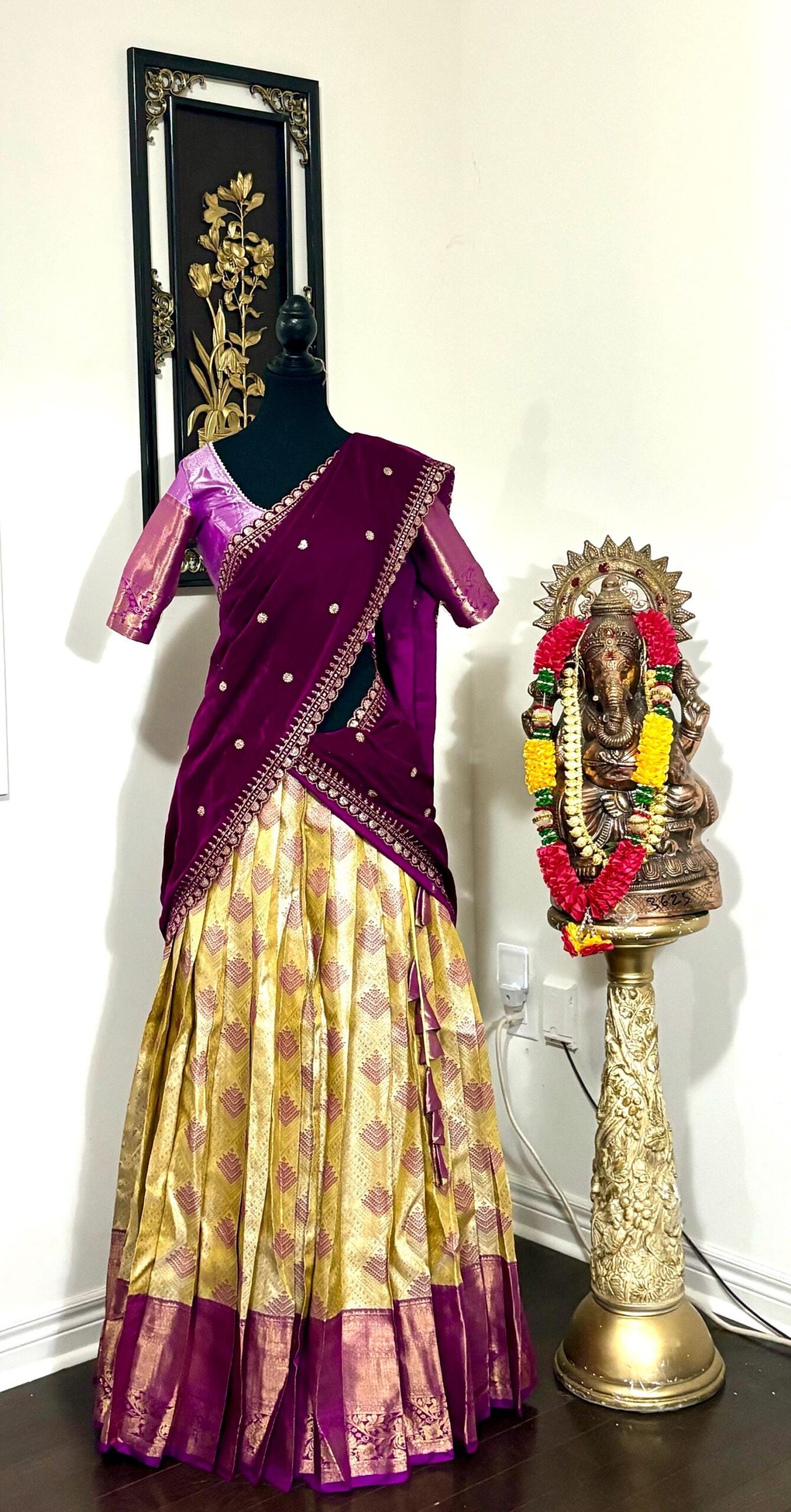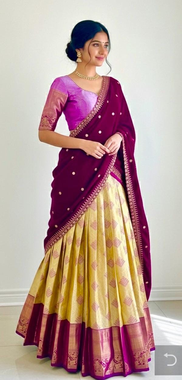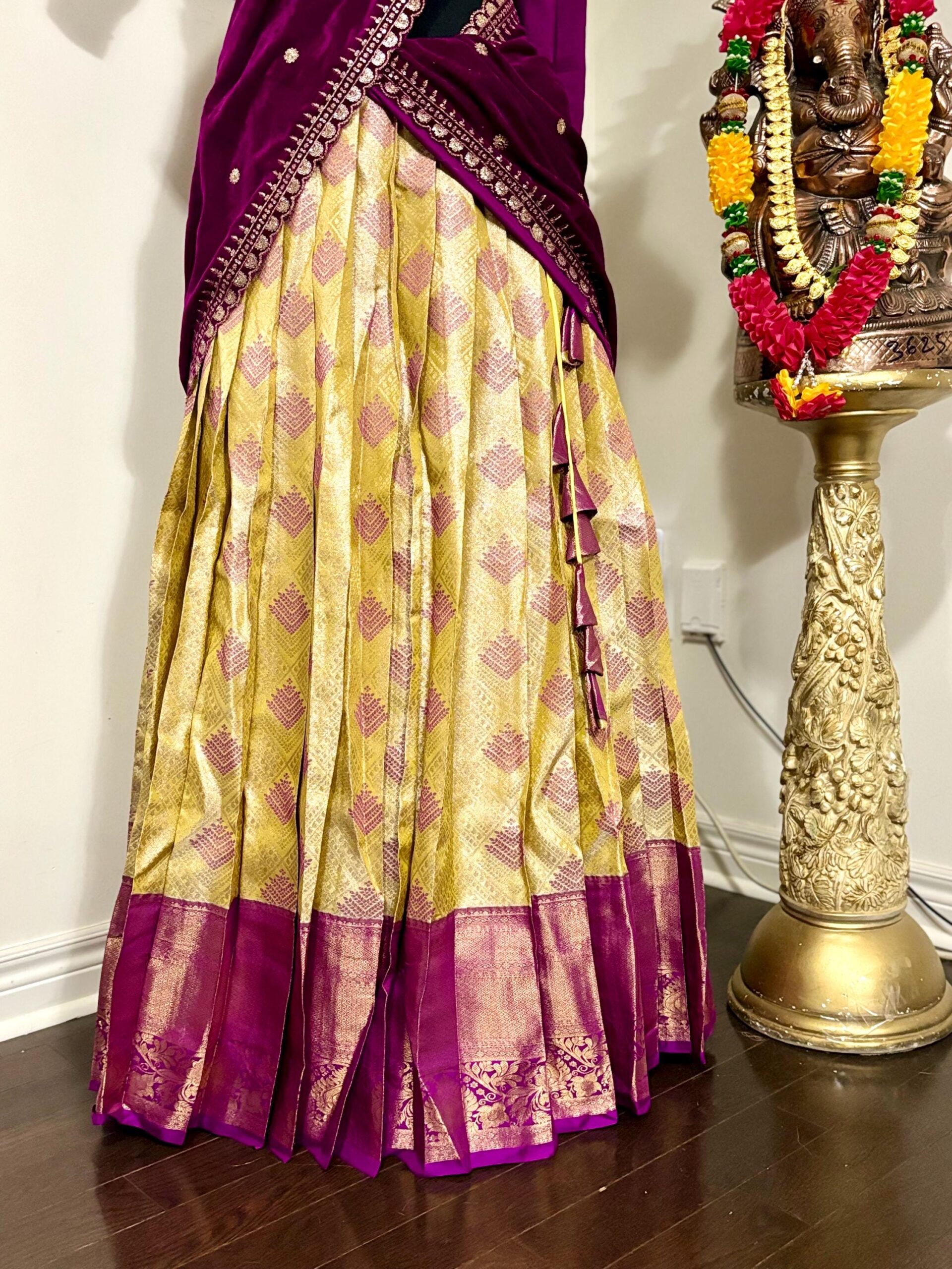 Yellow Purple Silk Lehenga Kanchi pattu Kanjeevaram Silk Lehenga