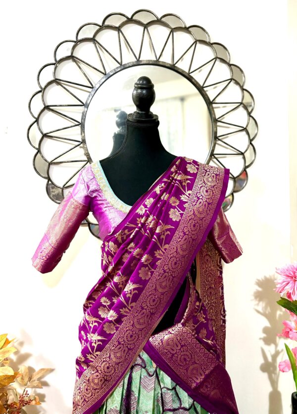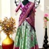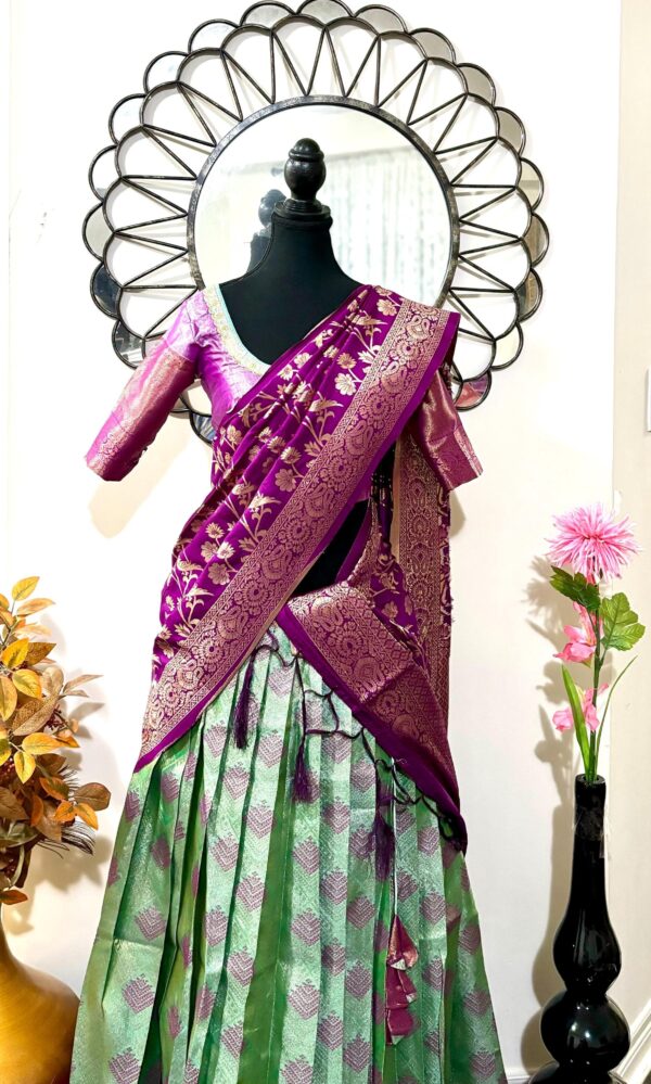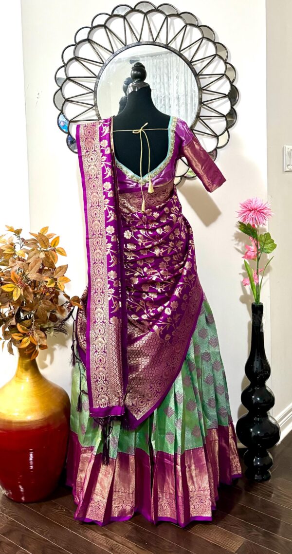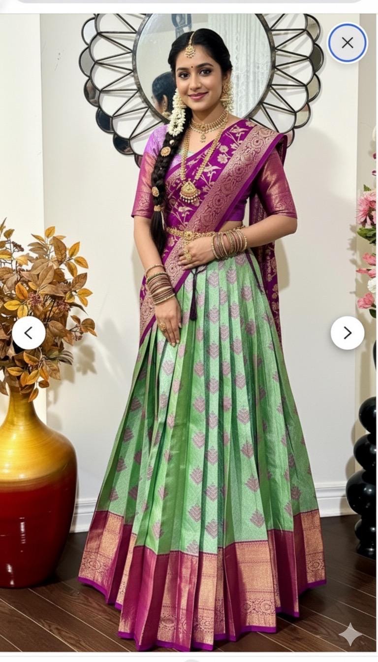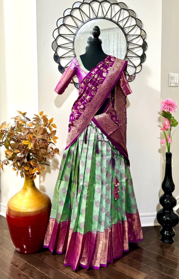 Purple Green Silk Lehenga Kanchi pattu Kanjeevaram Silk Lehenga Exclusive soft quality Kanchi pattu / Kanjeevaram silk lehenga with Kanchi boarder rich Kanchi border paired with Banarasi dupatta and blouse and high quality soft lining for baby skin