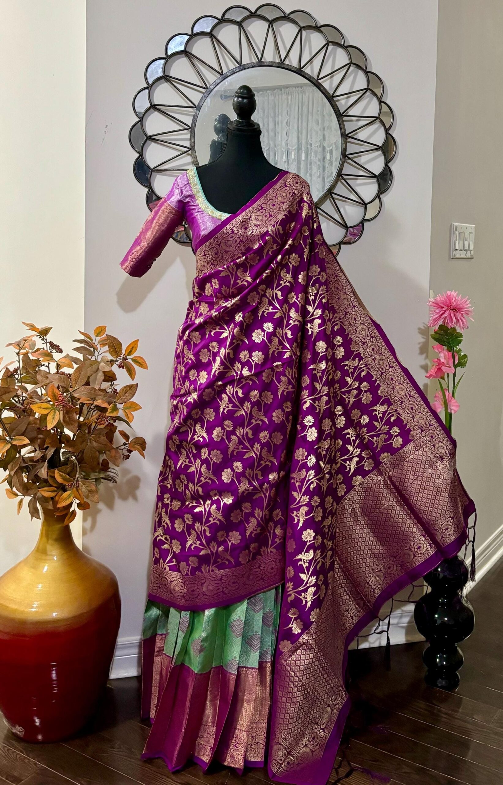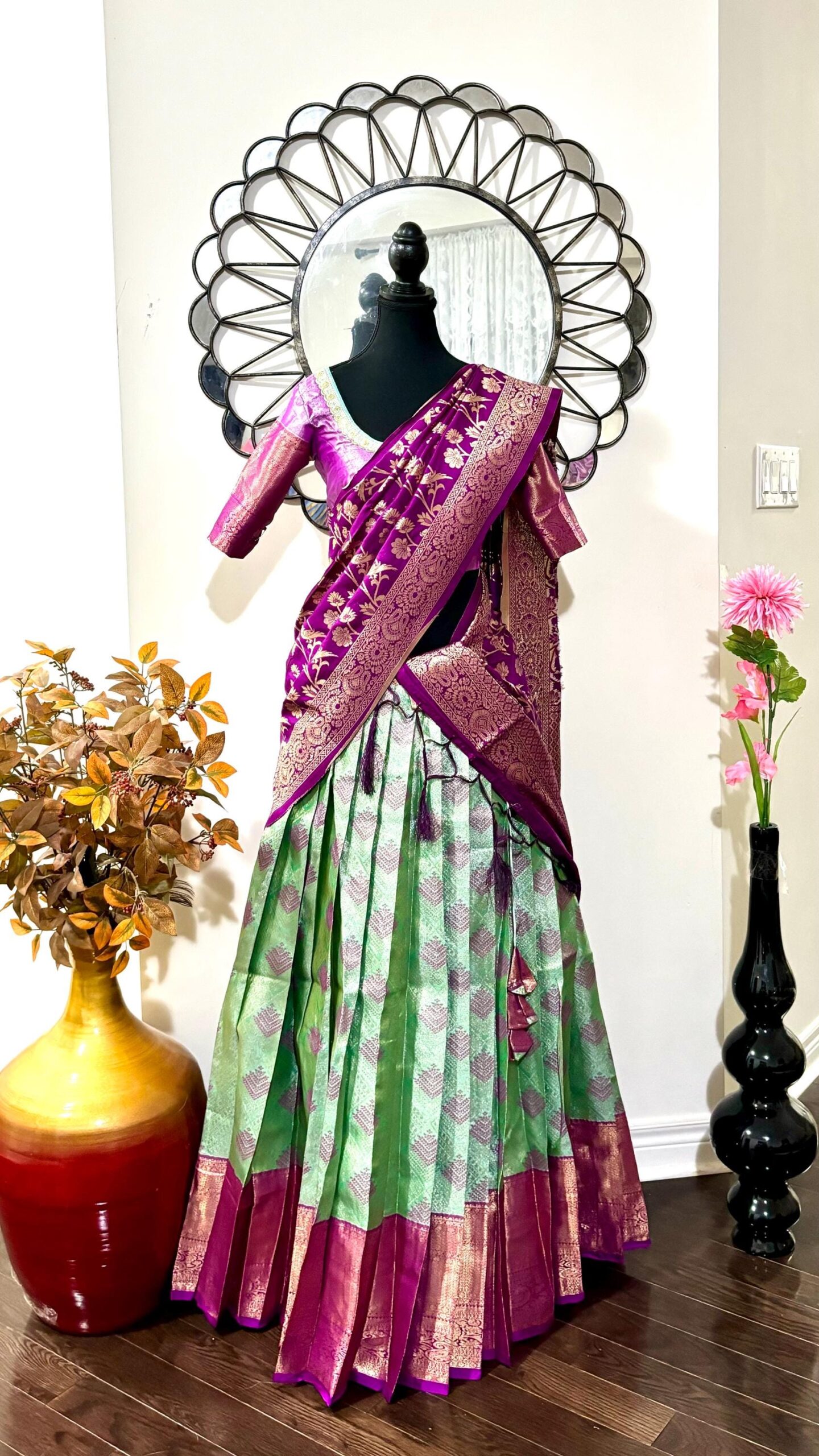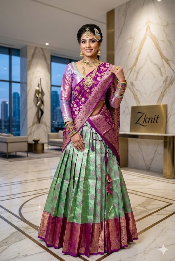 Purple Green Silk Lehenga Kanchi pattu Kanjeevaram Silk Lehenga Exclusive soft quality Kanchi pattu / Kanjeevaram silk lehenga with Kanchi boarder rich Kanchi border paired with Banarasi dupatta and blouse and high quality soft lining for baby skin