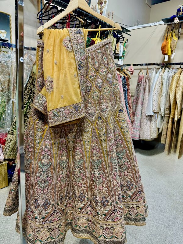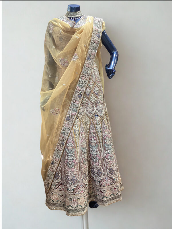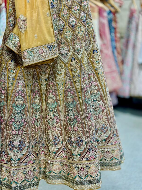 The lehenga features densely detailed thread, zari, and bead work in floral and vine motifs, showcasing pastel shades of pink, mint green, turquoise, and ivory that beautifully contrast the golden fabric.
