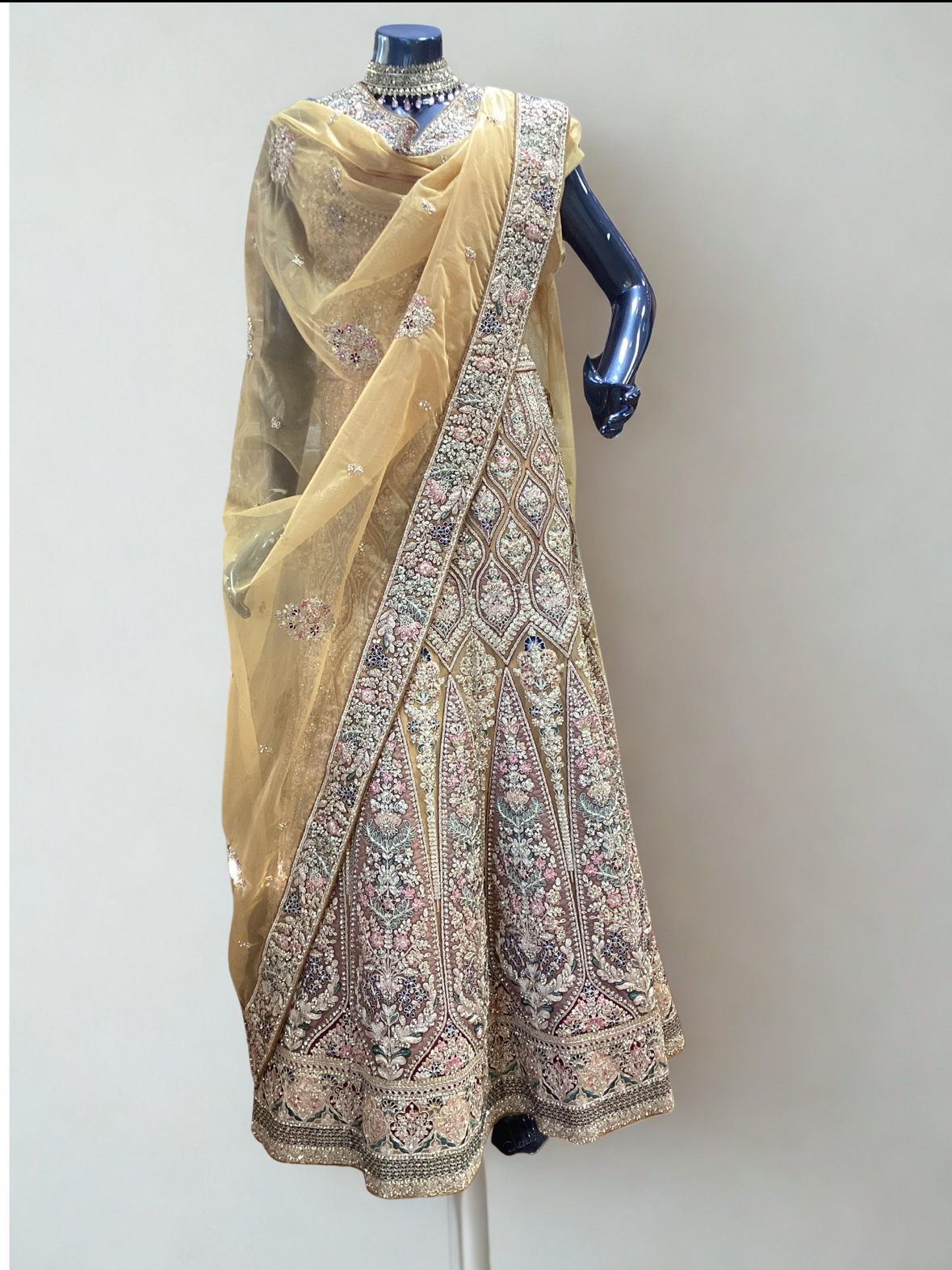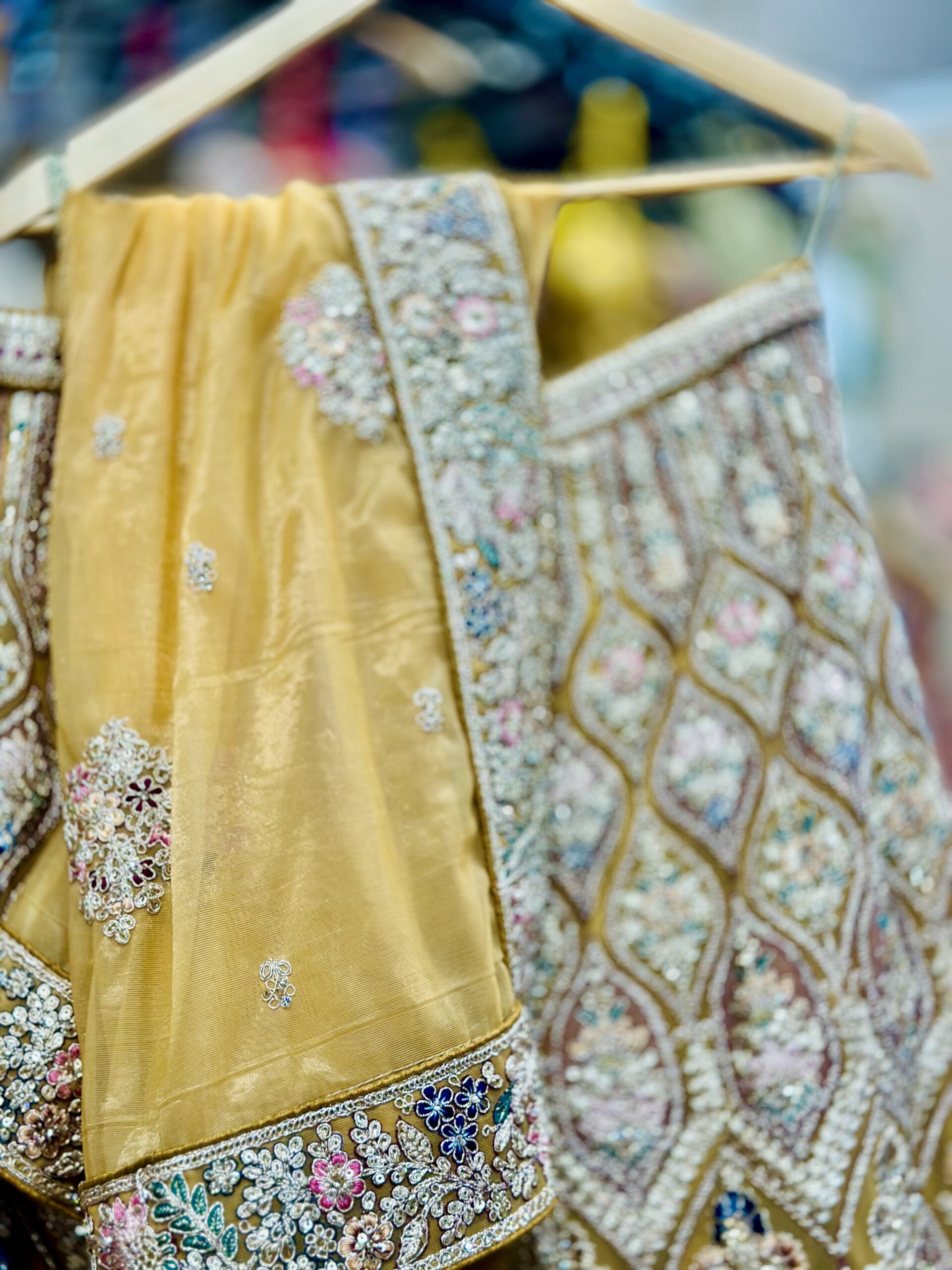The lehenga features densely detailed thread, zari, and bead work in floral and vine motifs, showcasing pastel shades of pink, mint green, turquoise, and ivory that beautifully contrast the golden fabric.