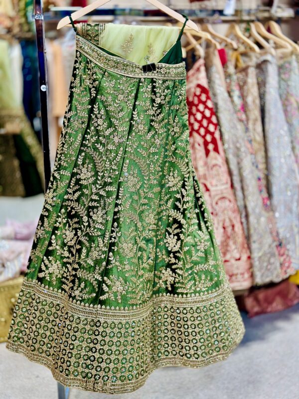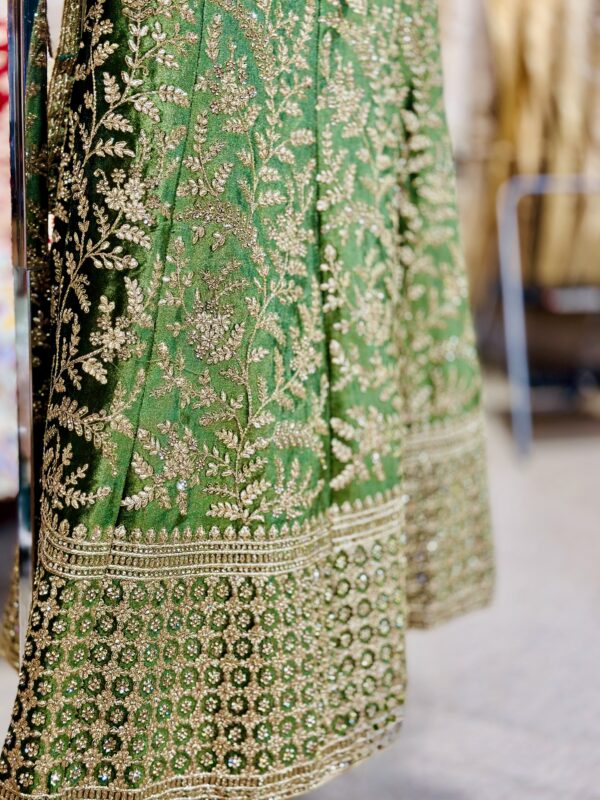This is a magnificent emerald green lehenga richly adorned with intricate golden embroidery. The design features elaborate floral and vine motifs that gracefully spread across the fabric, giving it a regal and traditional charm.