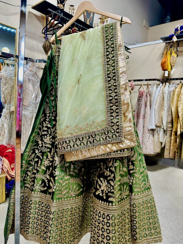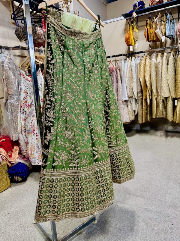 The waistband is highlighted with a delicate embroidered border, while a matching dupatta in a lighter green shade with golden detailing is draped along the hanger, complementing the overall look.