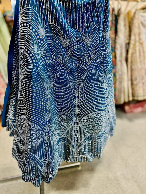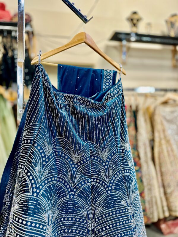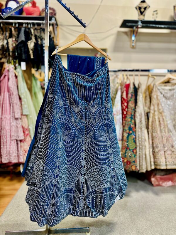 This is a stunning deep blue lehenga with an elegant and intricate design. The fabric features a geometric and fan-shaped pattern made with fine silver or white embellishments, possibly created through zari or sequins embroidery. The pattern runs vertically, creating a beautiful flow and elongating effect.