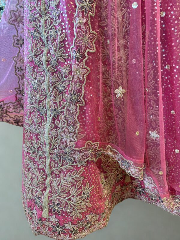 The blouse features intricate floral patterns with a modern neckline and half sleeves, perfectly complementing the flowing lehenga. The sheer net dupatta, bordered with ornate embroidery and scattered floral motifs, completes the ensemble with an ethereal grace. Ideal for weddings, receptions, and festive occasions, this lehenga captures the essence of luxury and sophistication, making it a timeless addition to any bridal or special occasion wardrobe.