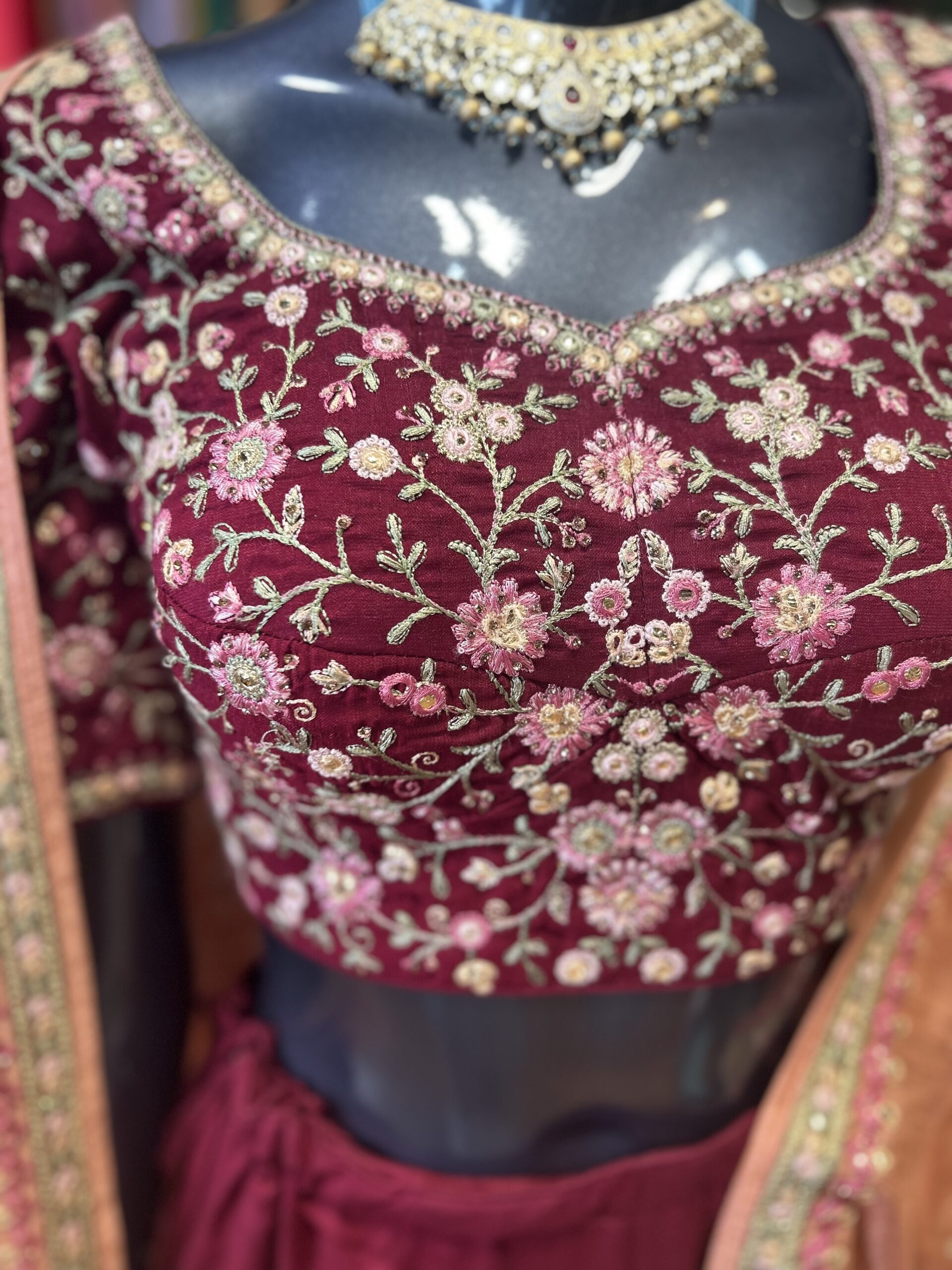 Make every occasion unforgettable with this elegant maroon lehenga set that blends tradition with modern sophistication.