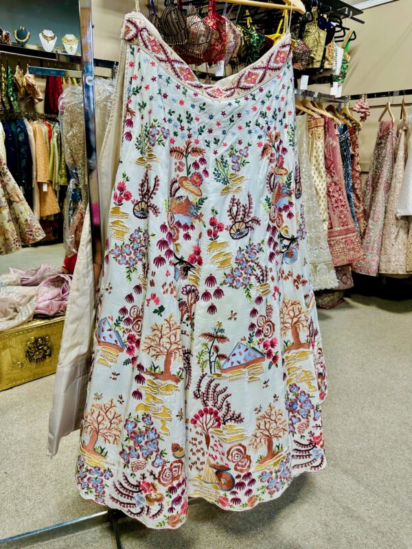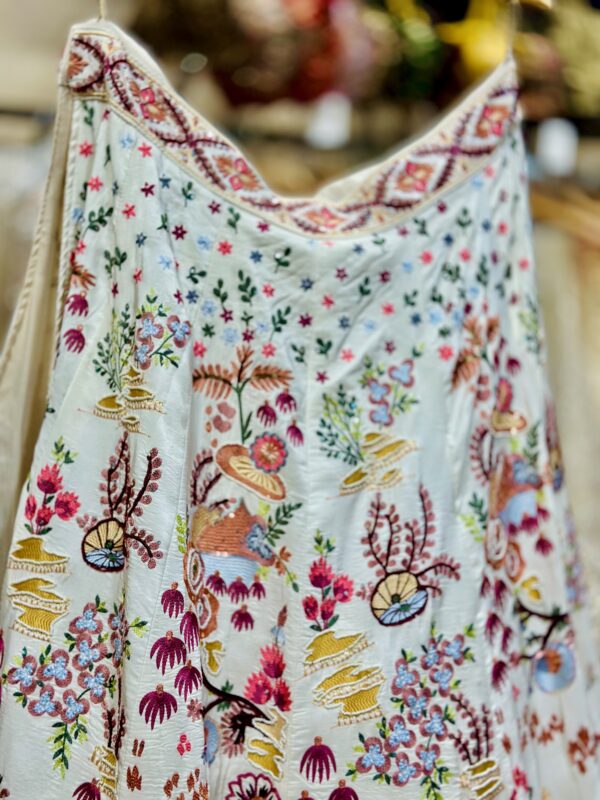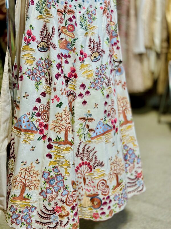 This lehenga is a vibrant and artistic piece that beautifully blends tradition with contemporary charm. Set on a soft ivory or cream base, the fabric is adorned with intricate multicolored thread embroidery depicting nature-inspired motifs — including trees, flowers, leaves, and small scenic elements resembling huts and wheels. The embroidery palette features cheerful tones of coral, rust, mustard, mint green, powder blue, and maroon, giving the outfit a whimsical, storybook-like appeal.