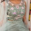 * **Blouse:** Sleeveless mint bodice adorned with delicate pink floral 3D sequins and intricate silver embroidery. 🌸