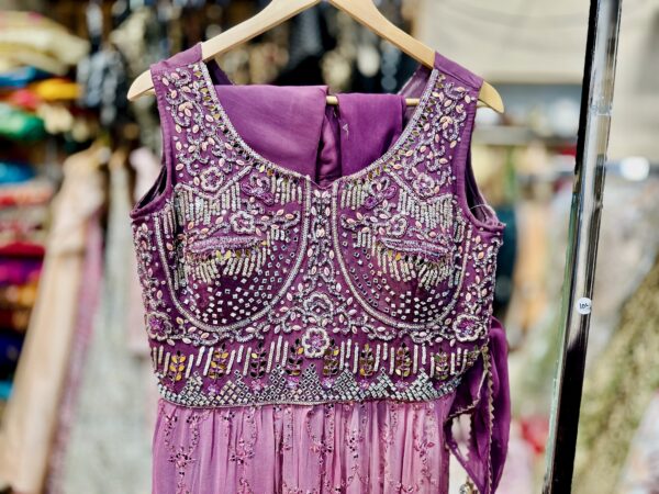 Make a bold yet elegant statement with this stunning purple western fusion dress, featuring a fully embellished blouseadorned with intricate beadwork, sequins, and delicate embroidery that sparkles with every movement. The blouse is tailored to perfection, offering a flattering silhouette with a modern neckline and structured fit.