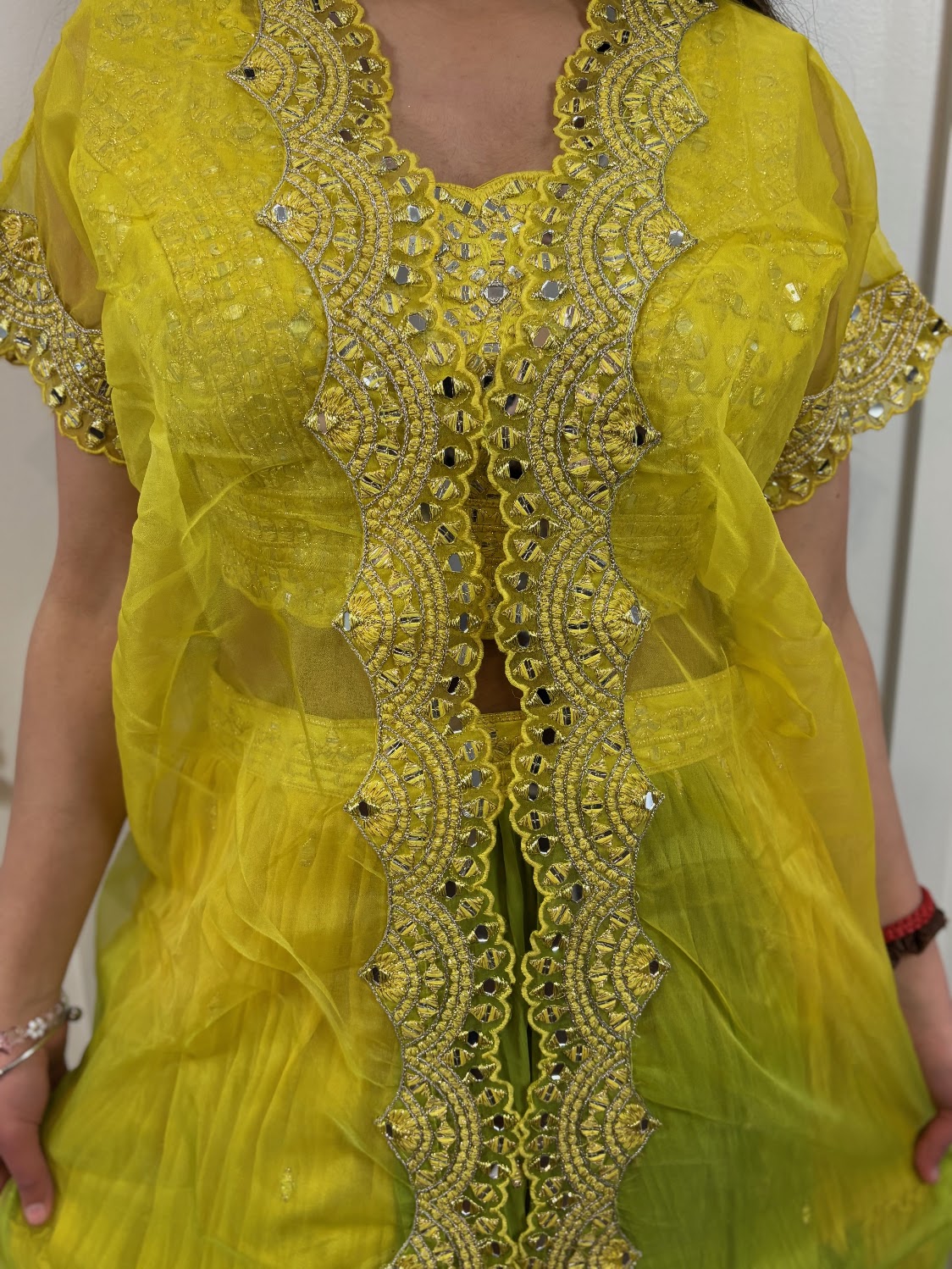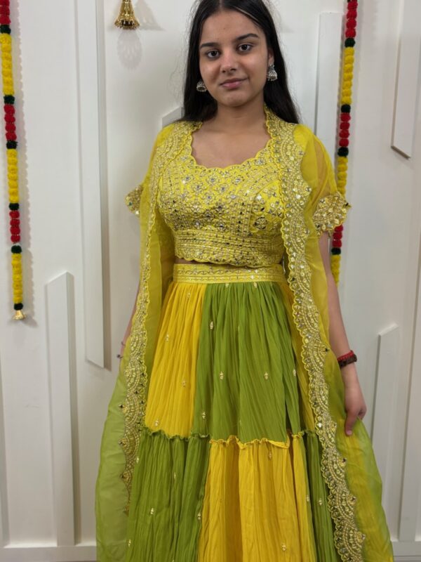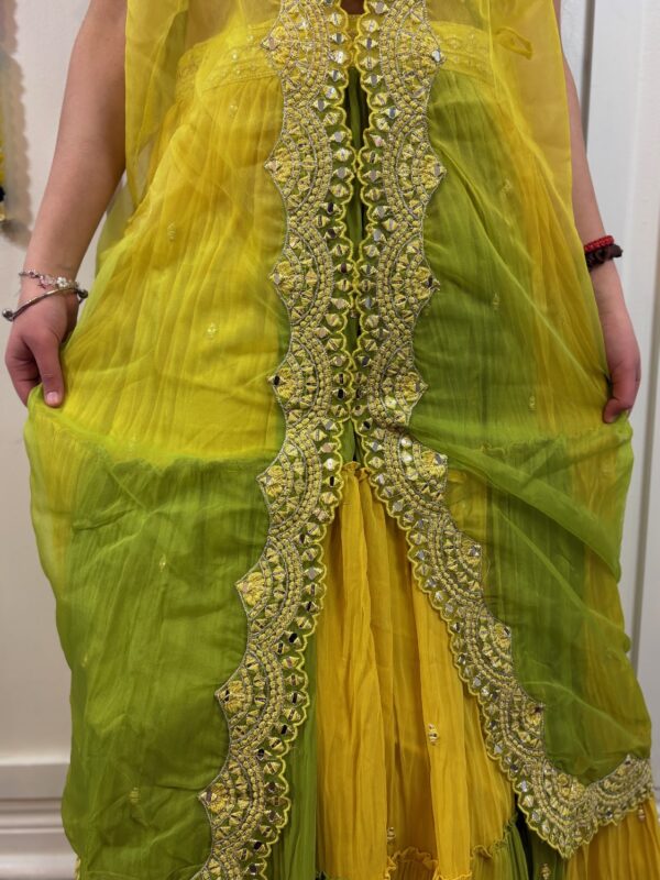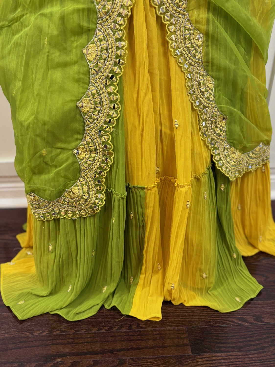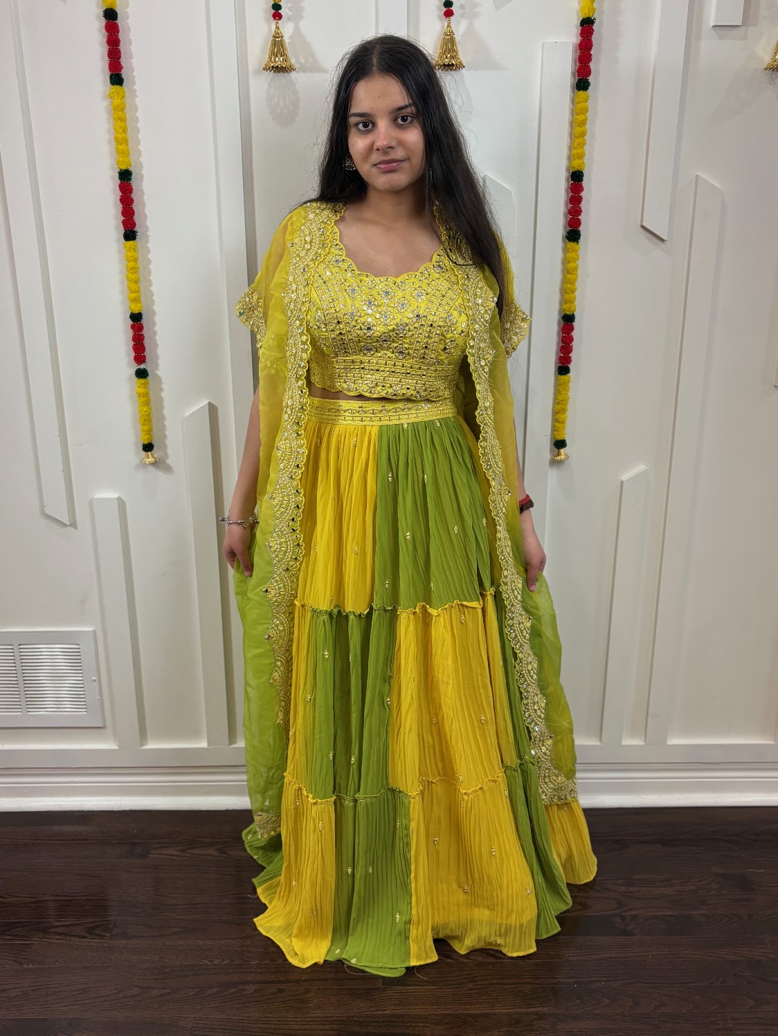 * **Skirt:** A voluminous, tiered lehenga skirt with a beautiful yellow-to-green ombré effect and pleated texture. 💃