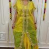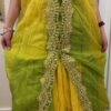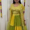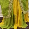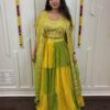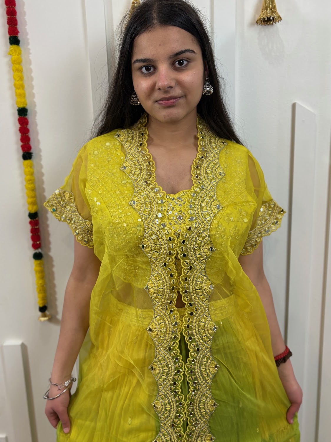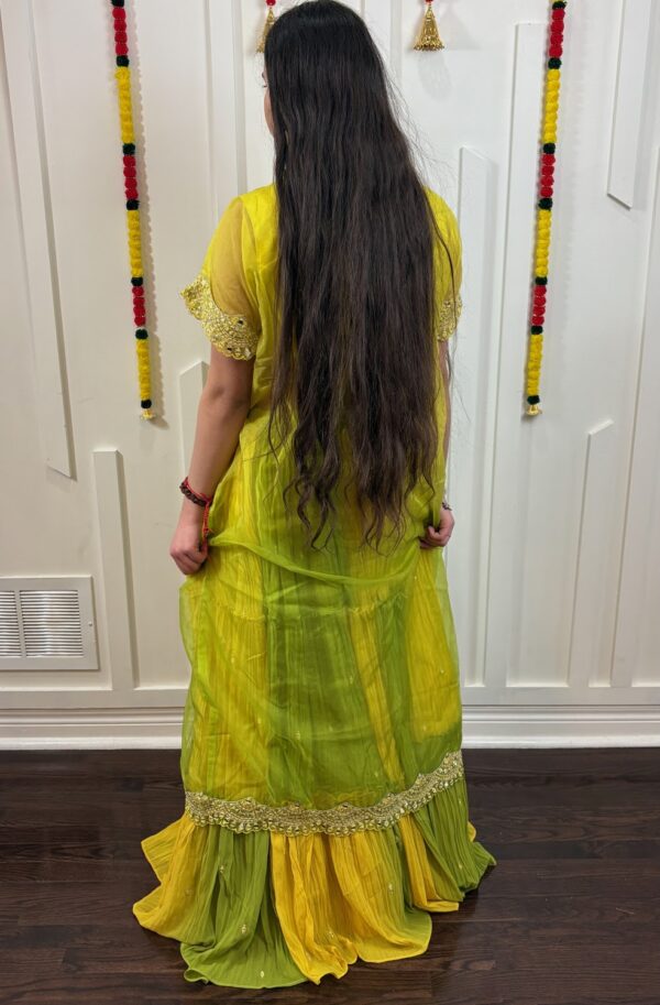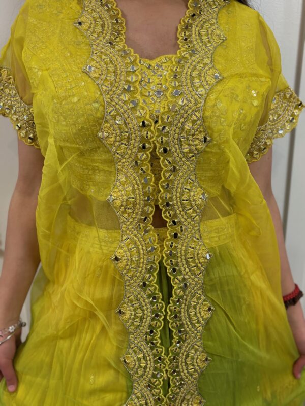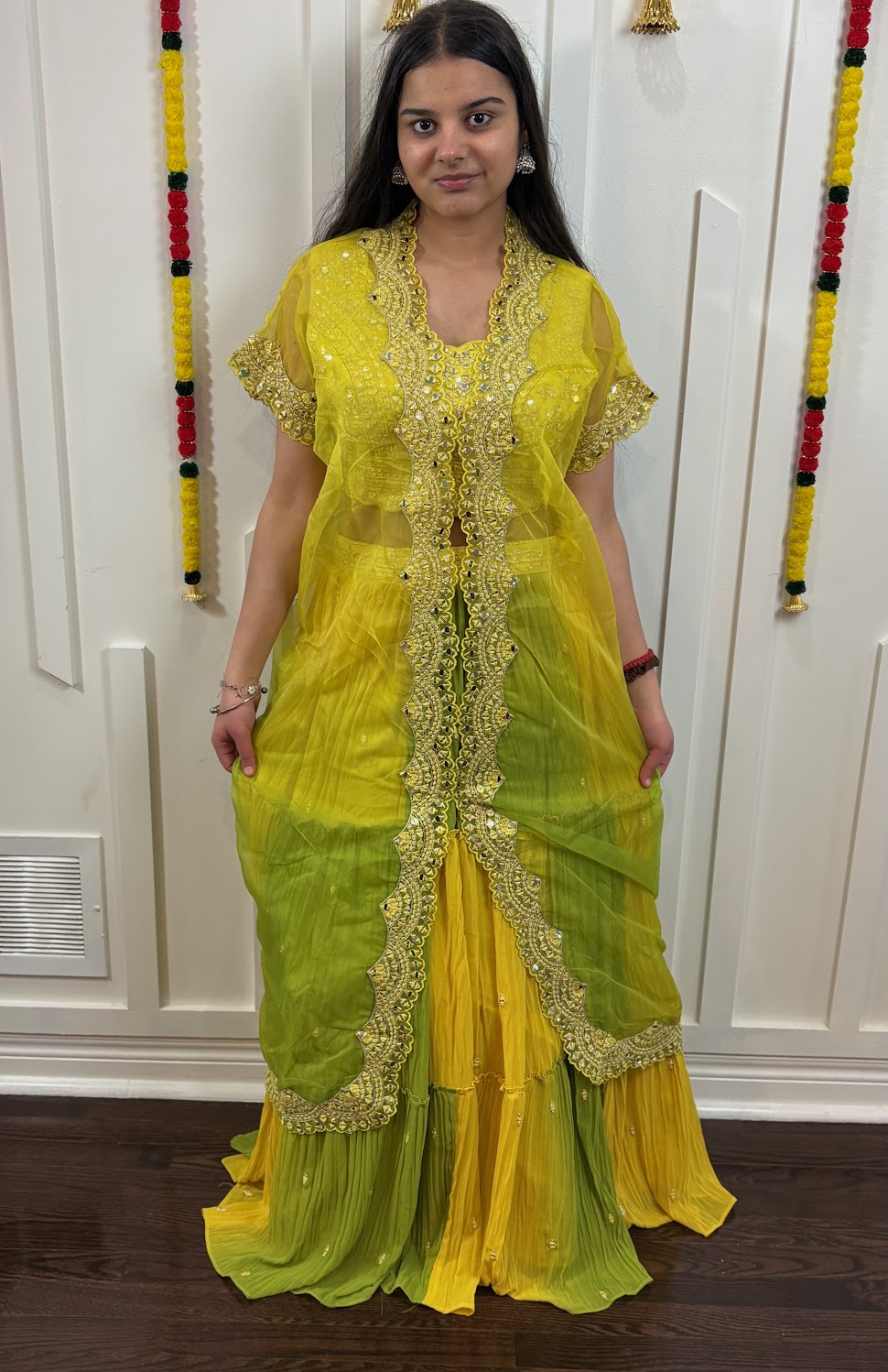 * **Skirt:** A voluminous, tiered lehenga skirt with a beautiful yellow-to-green ombré effect and pleated texture. 💃