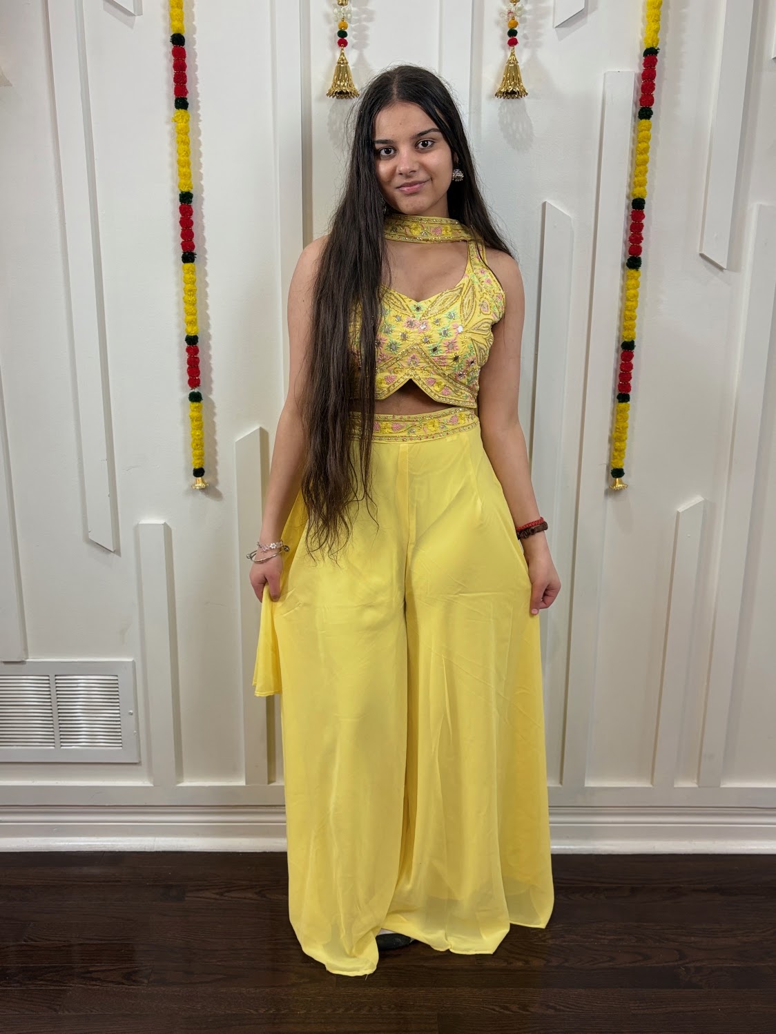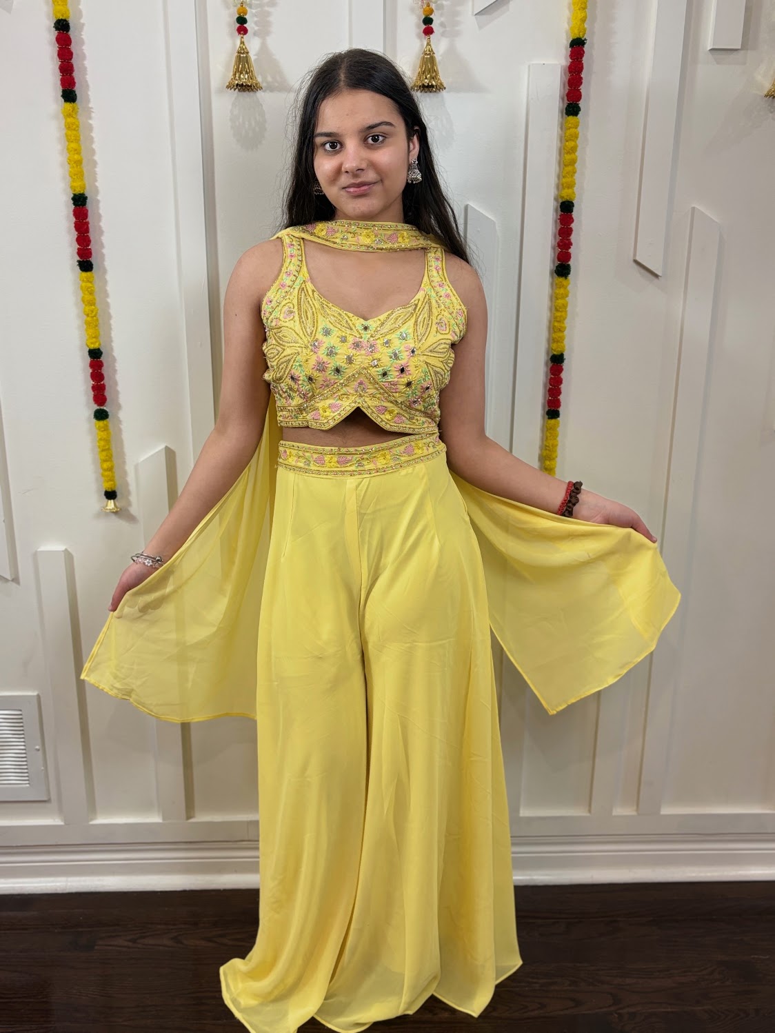 * **Bottom:** Flowy, high-waisted georgette flared trousers (Palazzos) for a comfortable yet regal silhouette. 💃