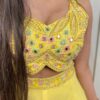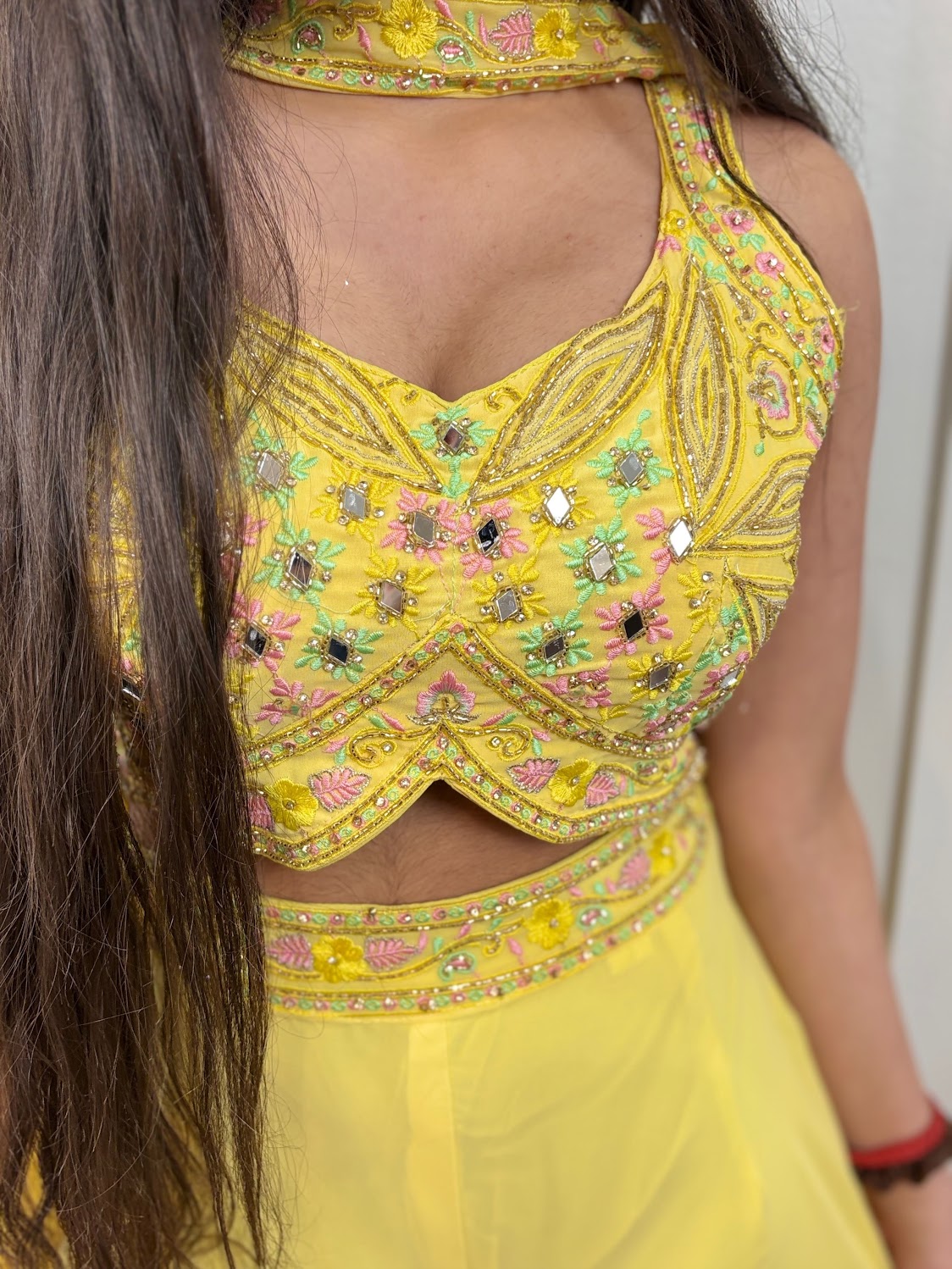* **Top:** Hand-embroidered halter-style crop top featuring intricate mirror work, floral thread embroidery, and gold zari detailing. 🪞