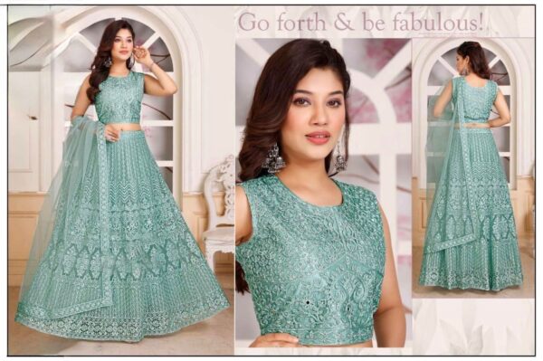 Step into the spotlight with this breathtaking seafoam green lehenga choli. Designed for the modern woman who loves a touch of tradition, this ensemble features intricate embroidery and delicate mirror-work that catches every bit of light. 🕊️