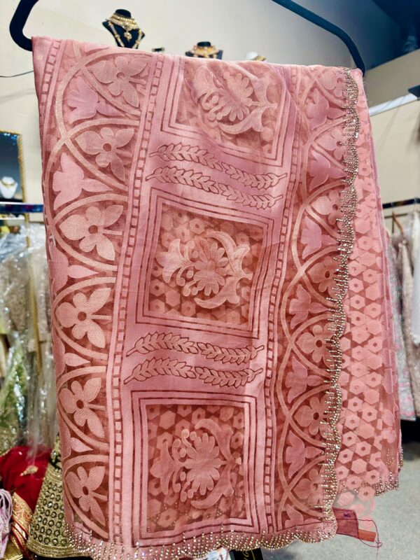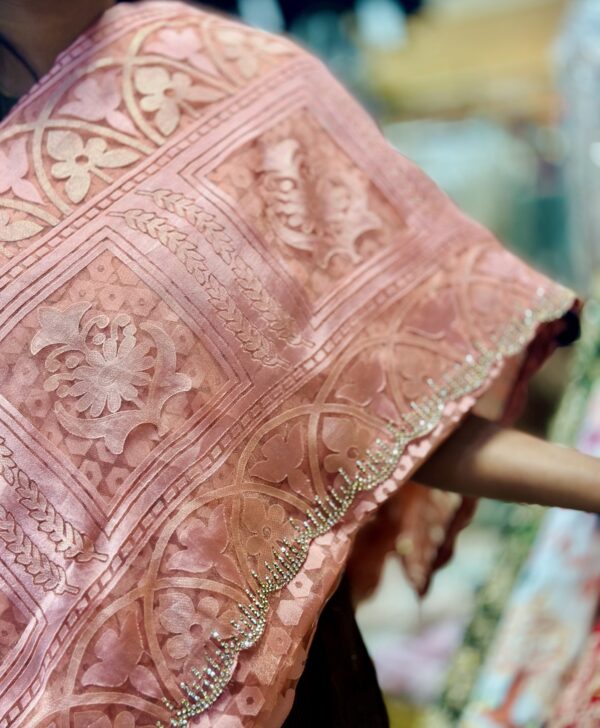 Graceful and effortlessly elegant, this pink organza saree is a timeless piece that exudes delicate charm. Crafted from lightweight, sheer organza, the saree features an all-over self-design that adds subtle texture and depth without overpowering its soft, feminine hue.