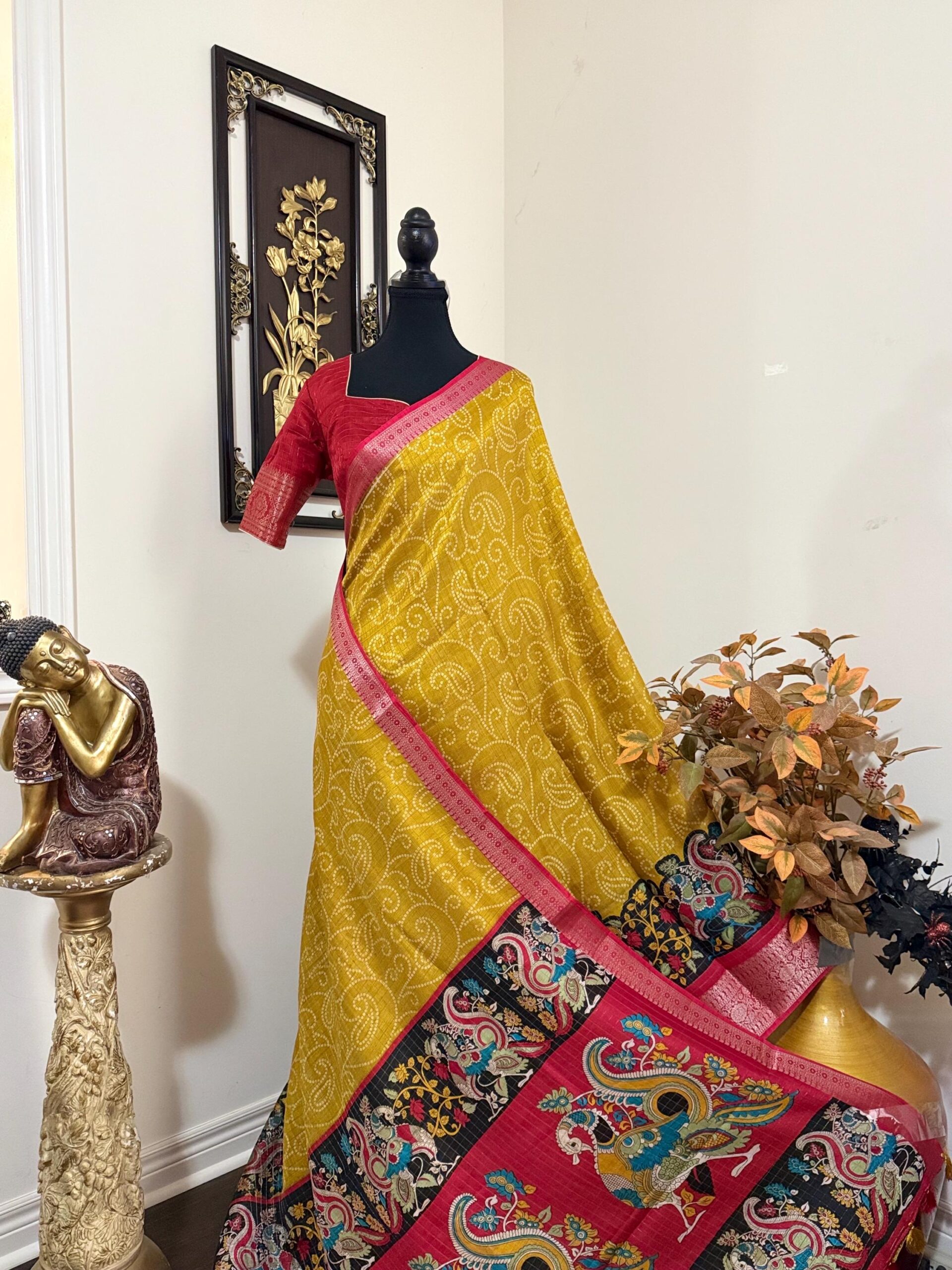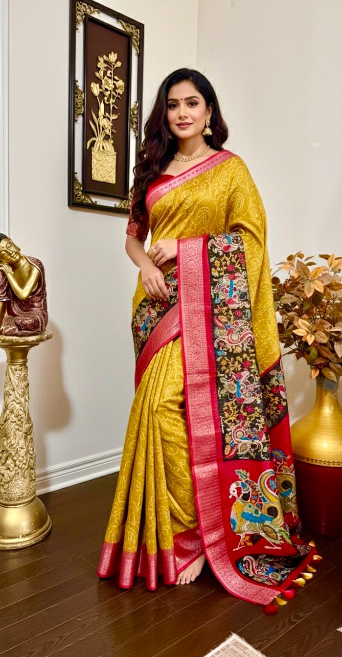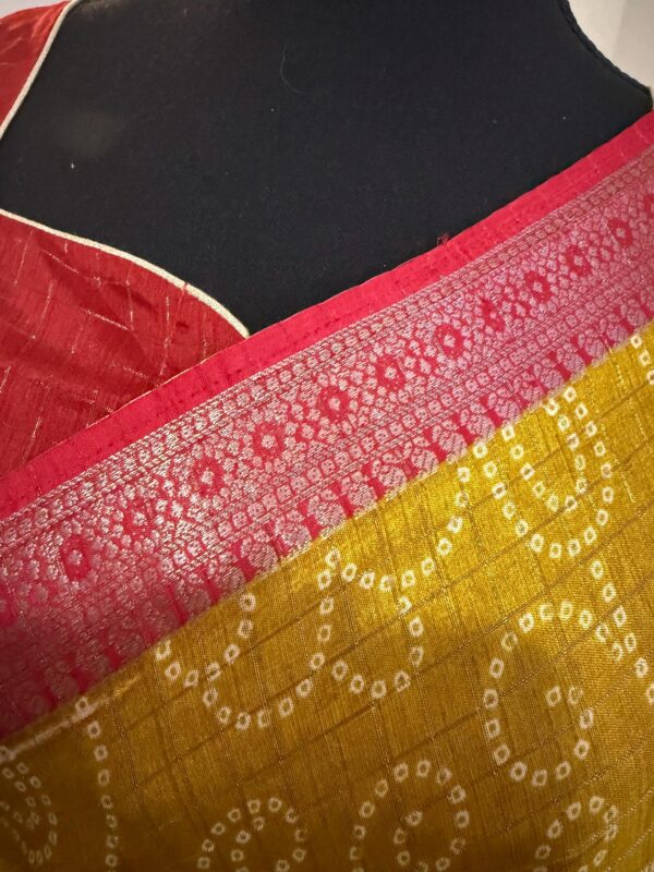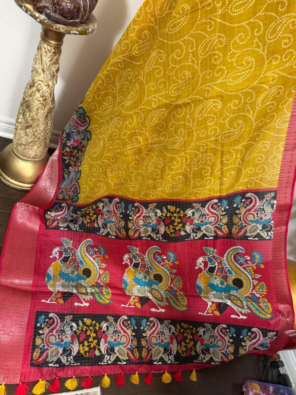 Beautiful Light weight Emerald silk saree with Kanchi boarder beautiful Bhandini prints all over ..beautiful peacock prints along with boarder 🦚 with ready to wear blouse fits 32 to 46 with beautiful color combo