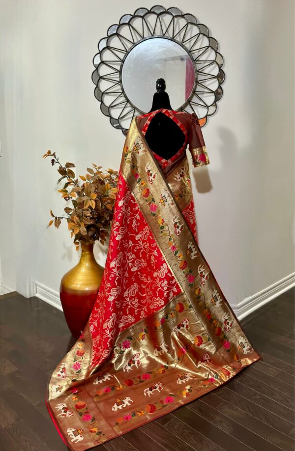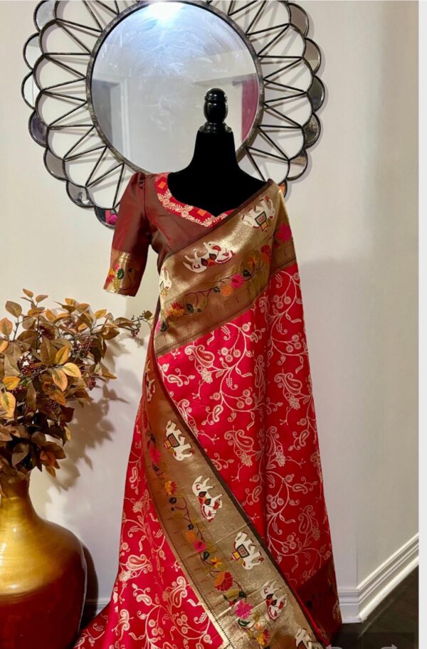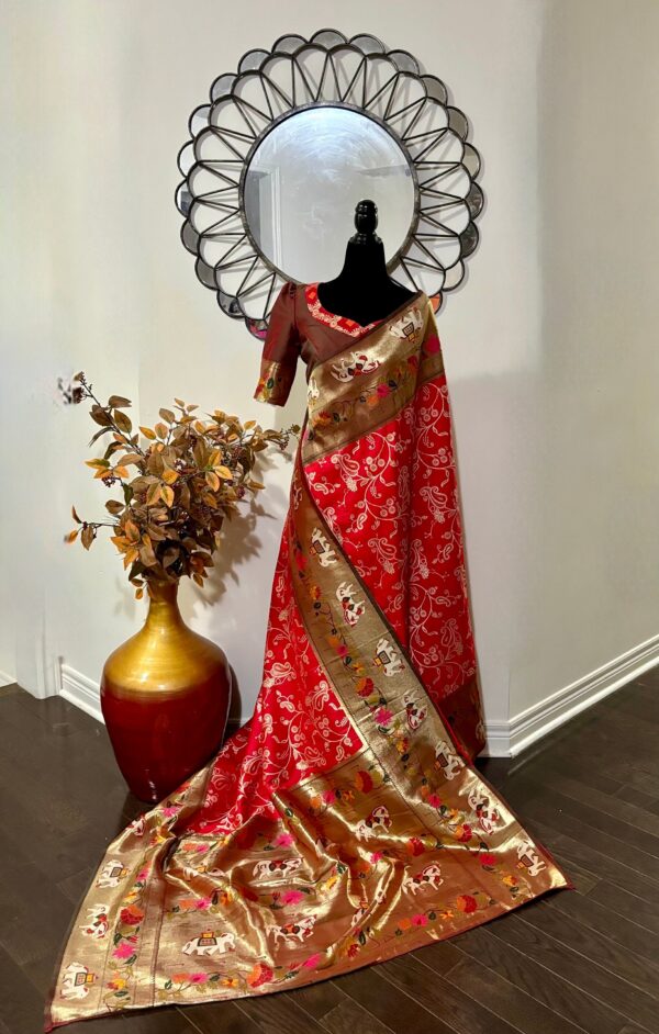 Red Paithani or Pythani semi silk saree with beautiful color all over with pythani boarder and beautiful pythani pallu design all over pallu the saree Handloom silk with Rich pallu, full body woven embossed design along with rich look blouse attached with the Saree
