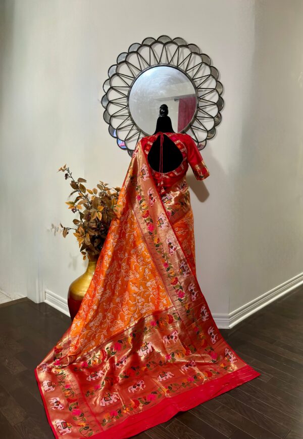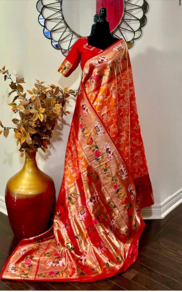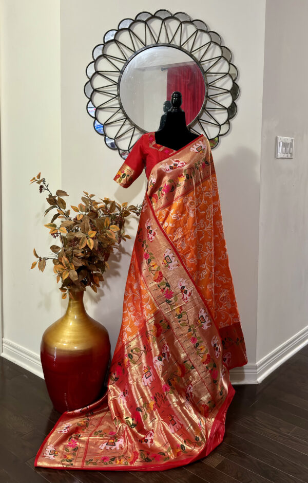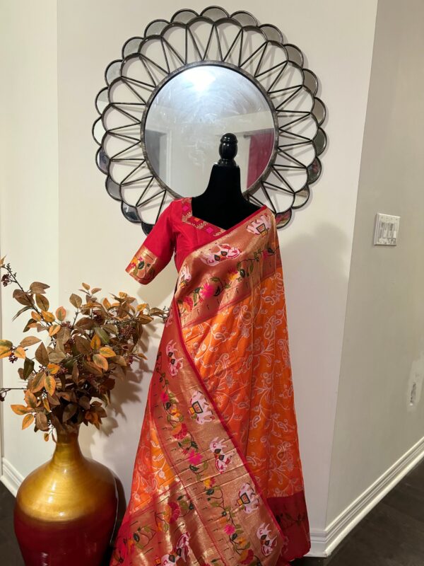 Orange Red Pythani or Paithani Semi Silk saree beautiful color all over with pythani boarder and beautiful pythani pallu design all over pallu the saree Handloom silk with Rich pallu, full body woven embossed design along with rich look blouse attached with the Saree