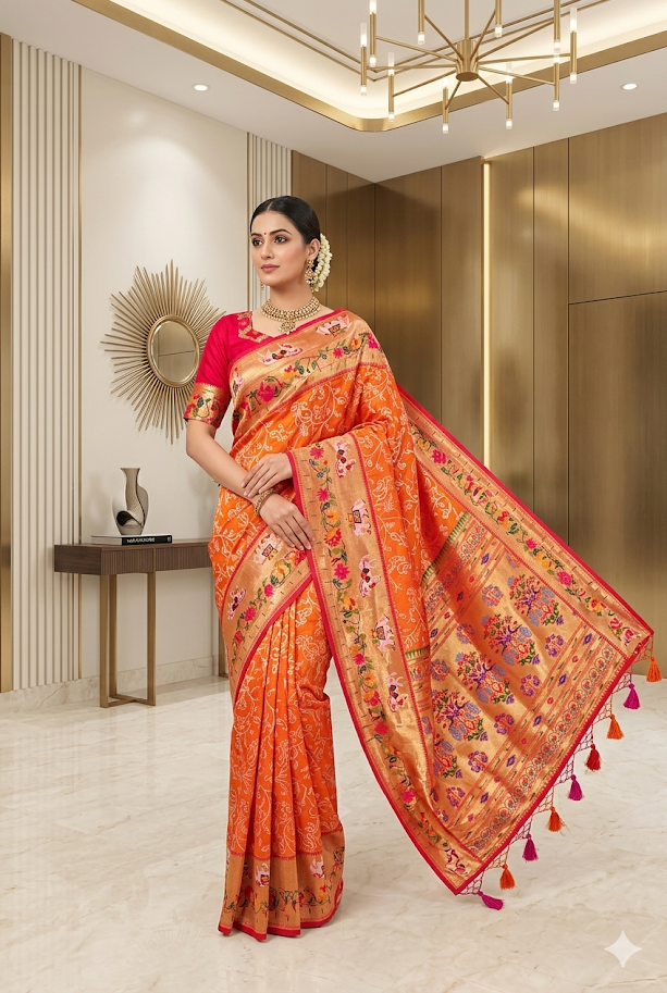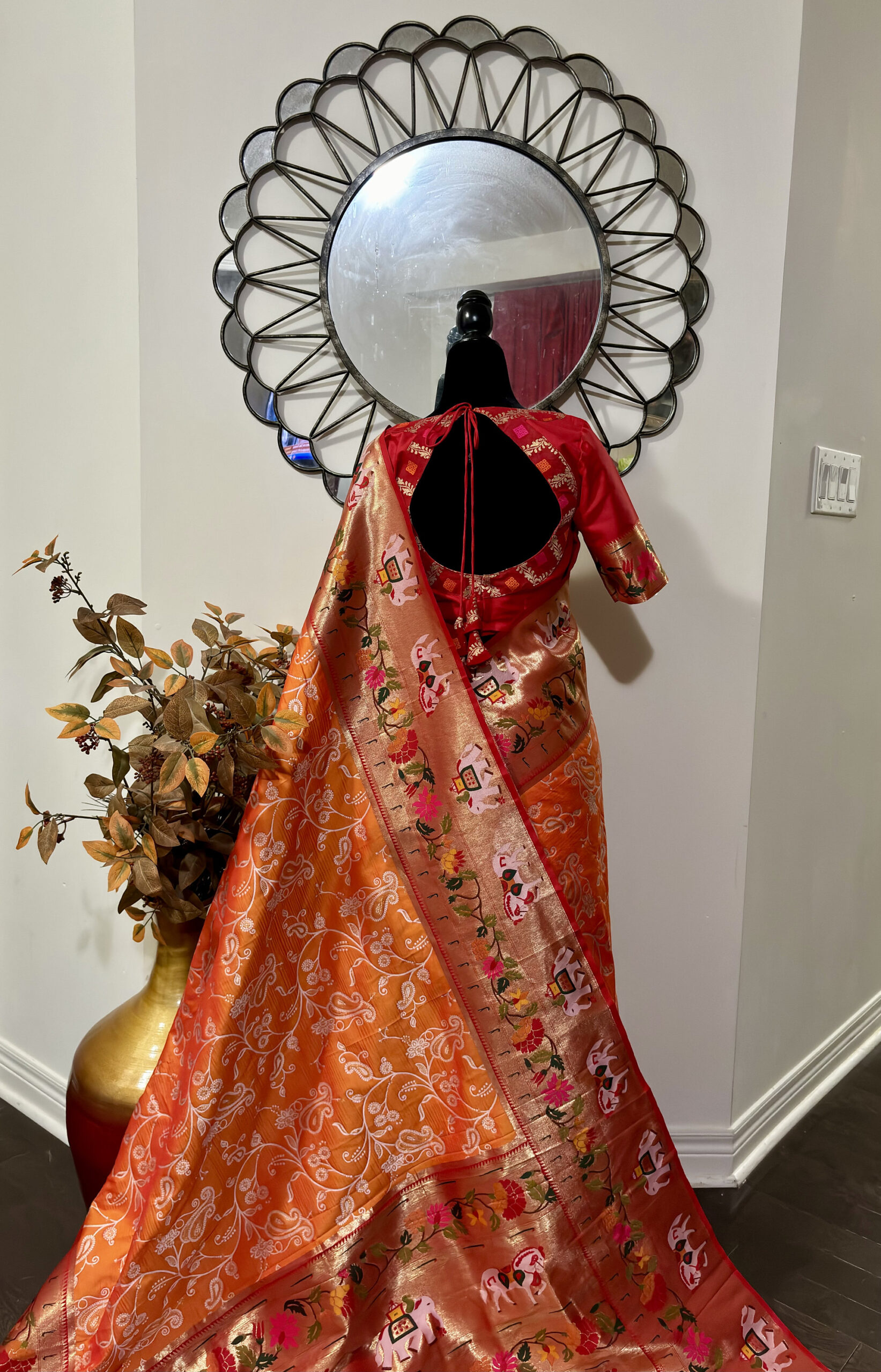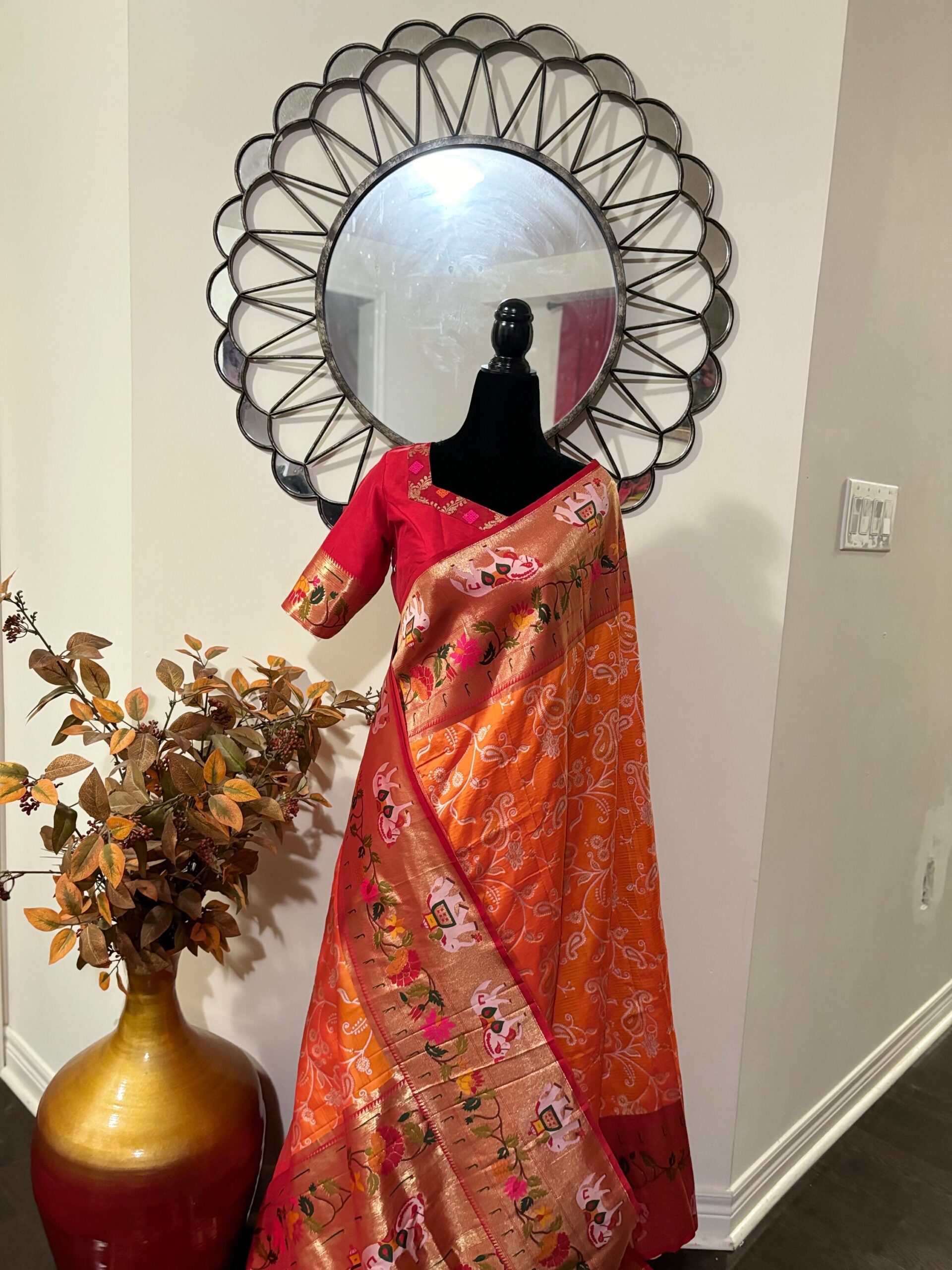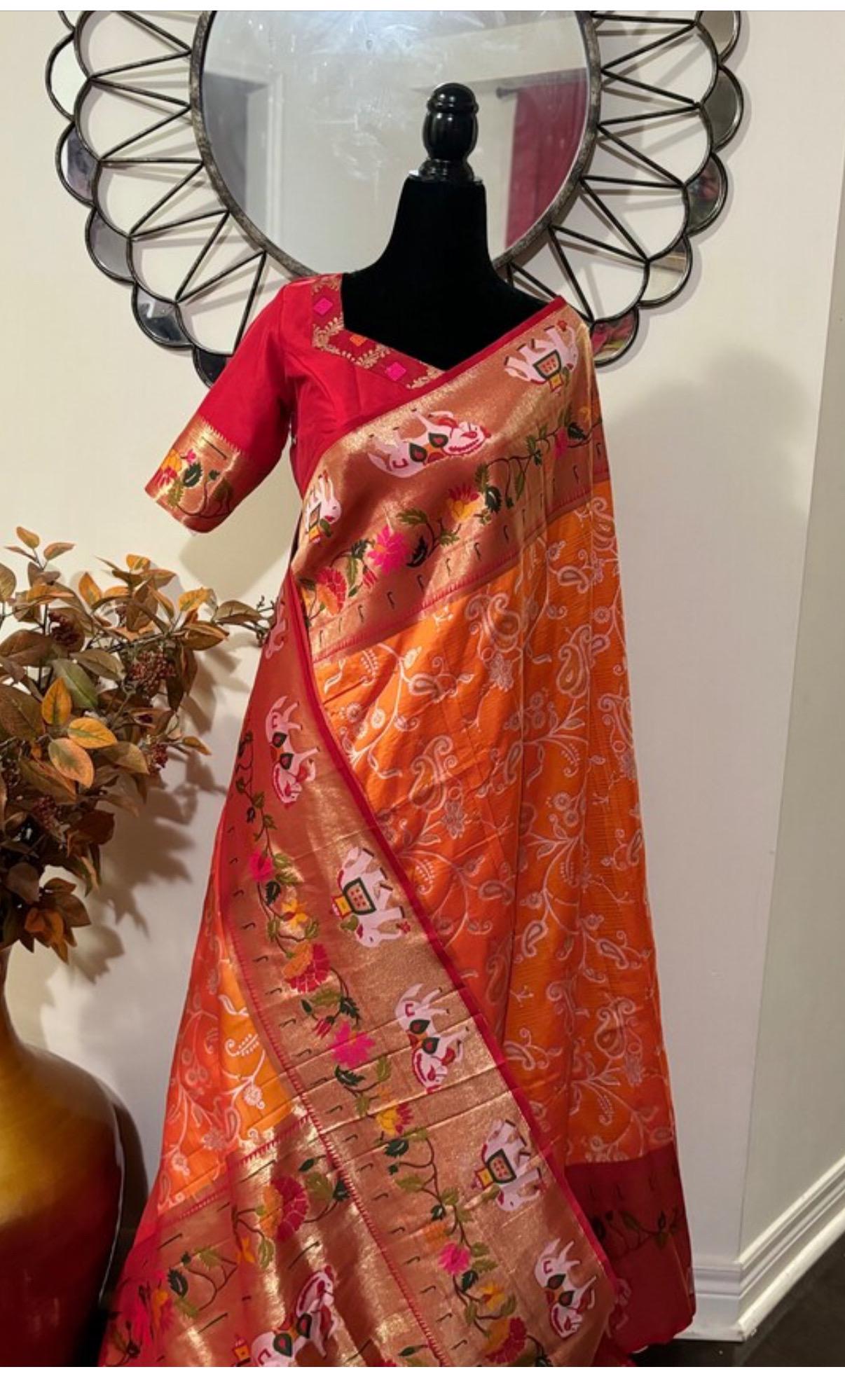 Orange Red Pythani or Paithani Semi Silk saree beautiful color all over with pythani boarder and beautiful pythani pallu design all over pallu the saree Handloom silk with Rich pallu, full body woven embossed design along with rich look blouse attached with the Saree