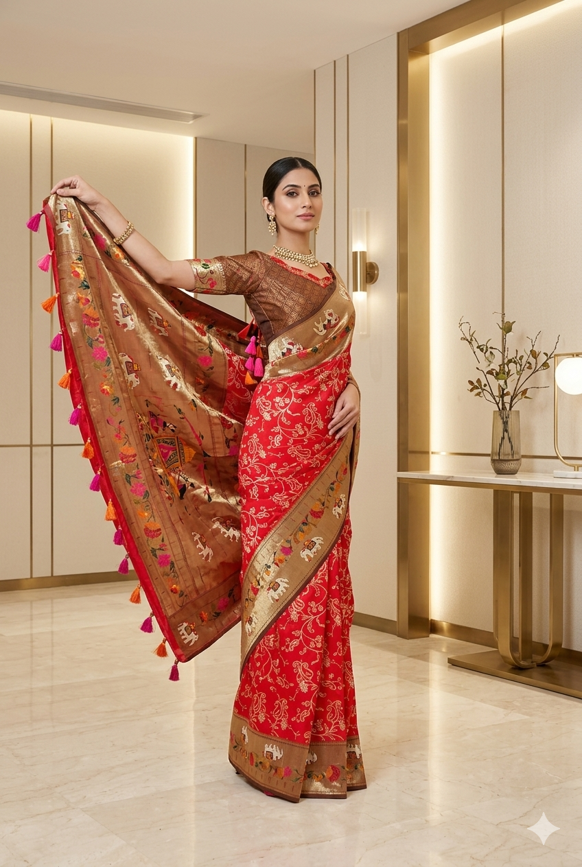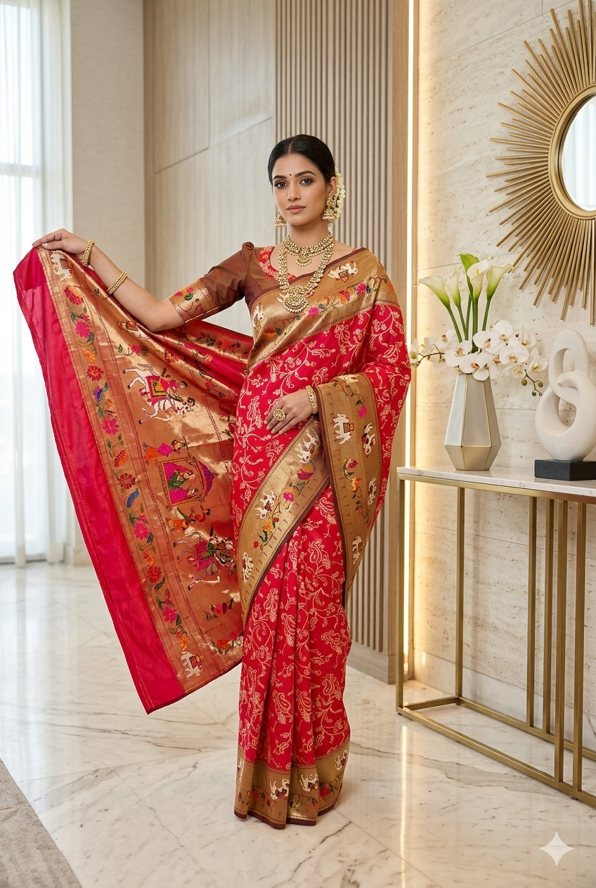Red Paithani or Pythani semi silk saree with beautiful color all over with pythani boarder and beautiful pythani pallu design all over pallu the saree Handloom silk with Rich pallu, full body woven embossed design along with rich look blouse attached with the Saree