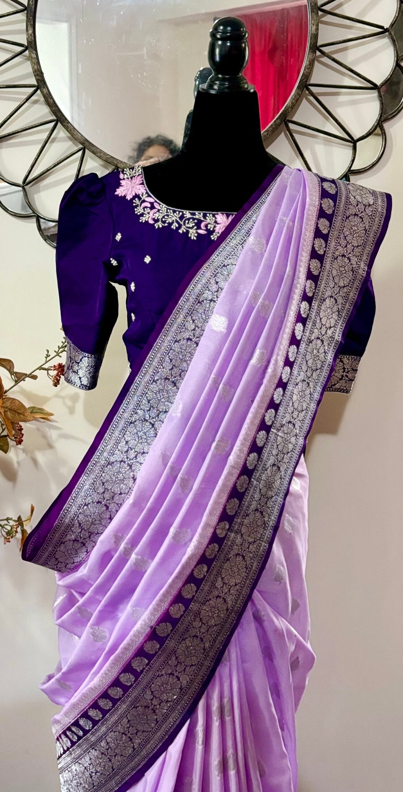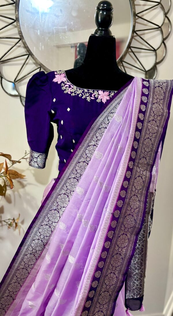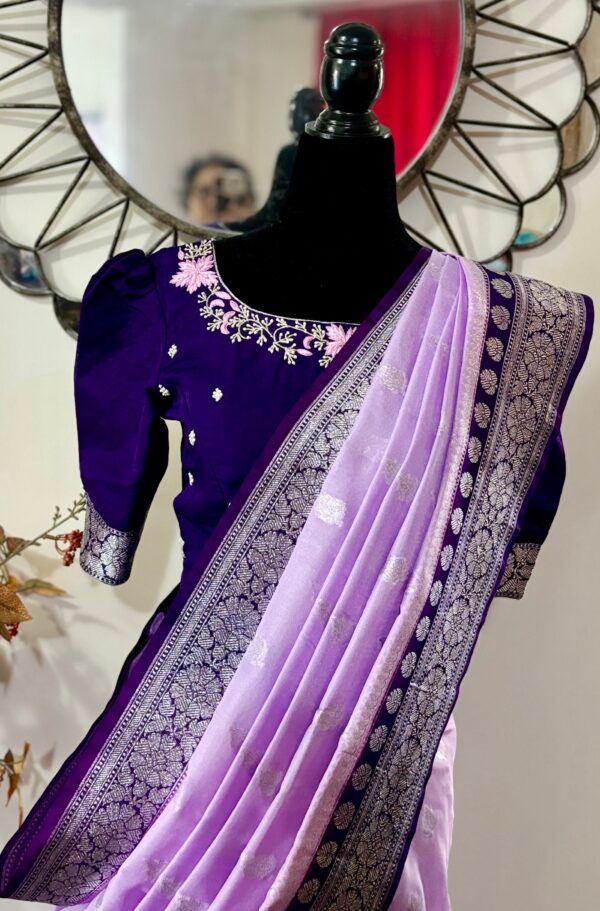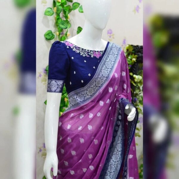 Beautiful banarasi saree paired up with pretty maggam work blouse.