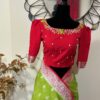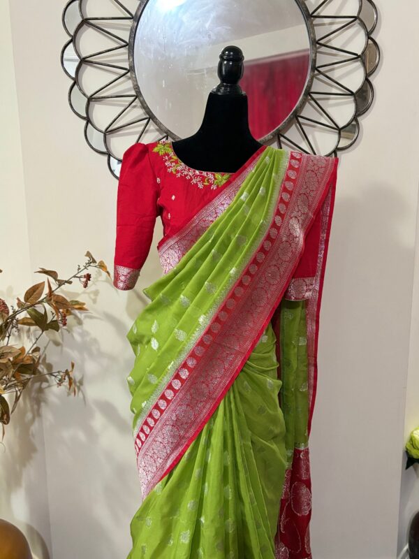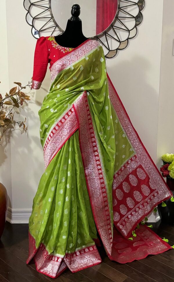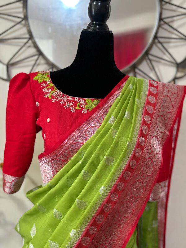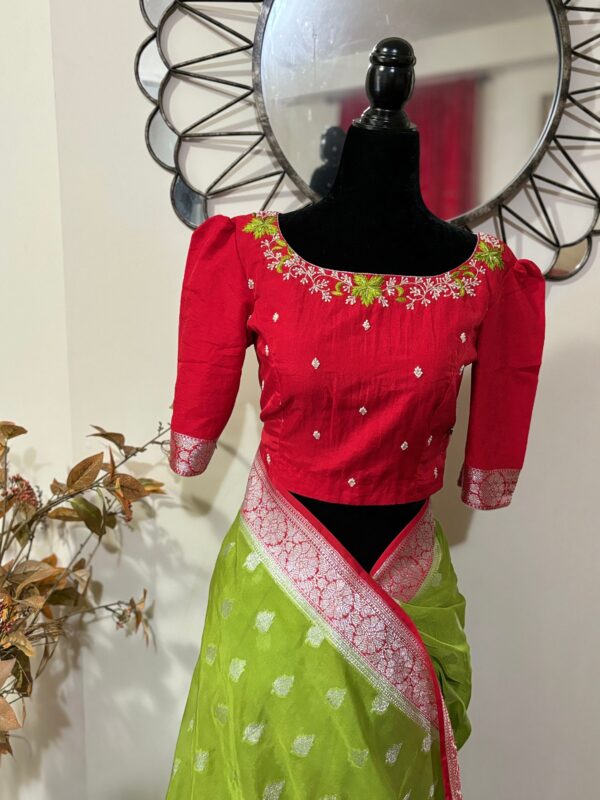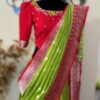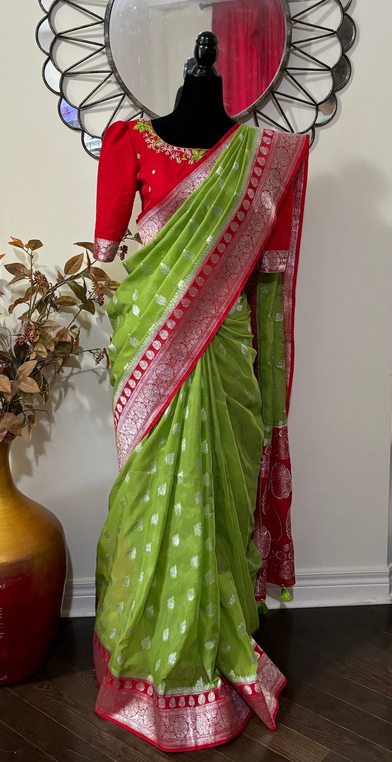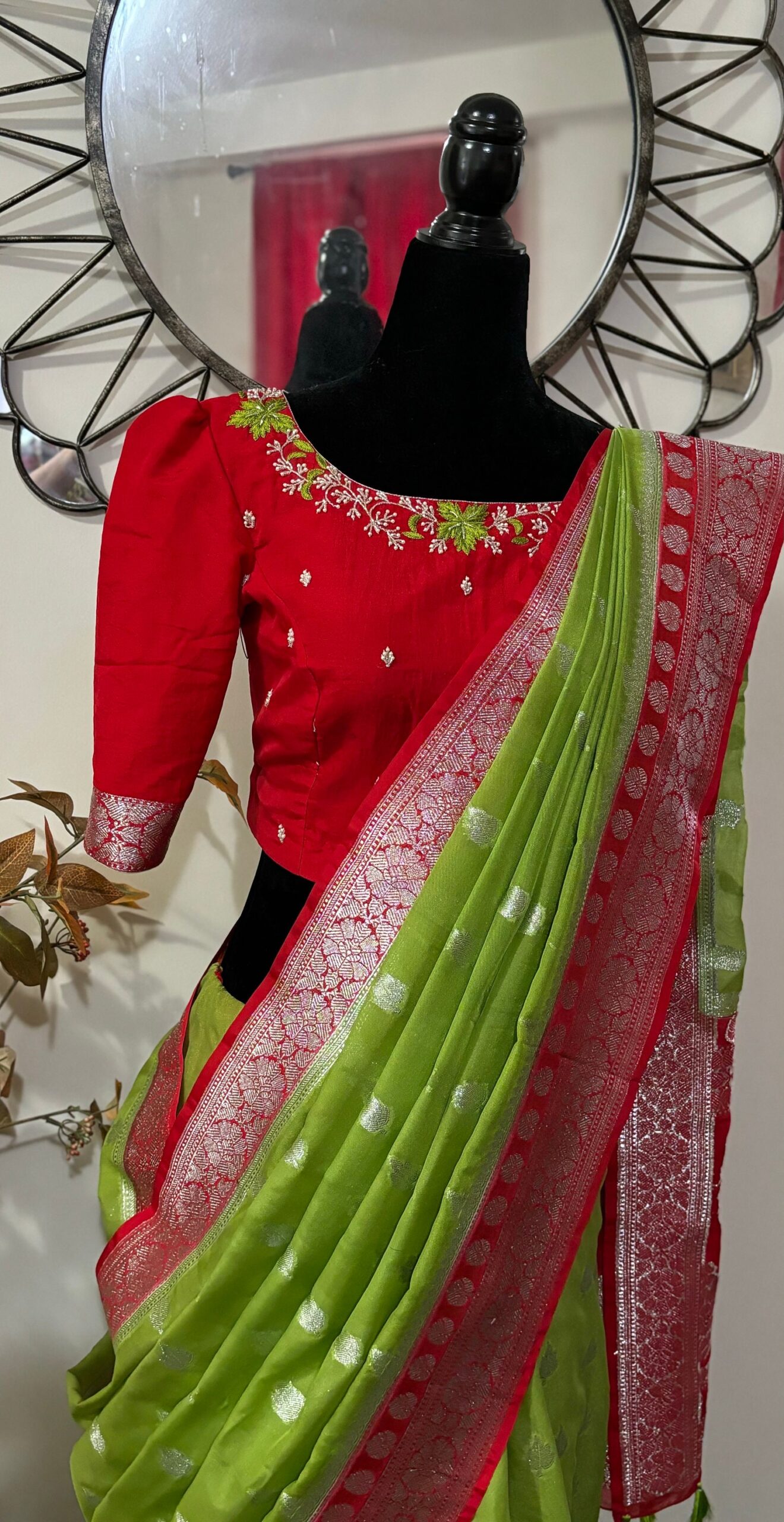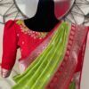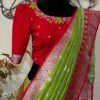Banarasi Katan Pure Silk saree in Light Green and Red paired up with pretty maggam work blouse.