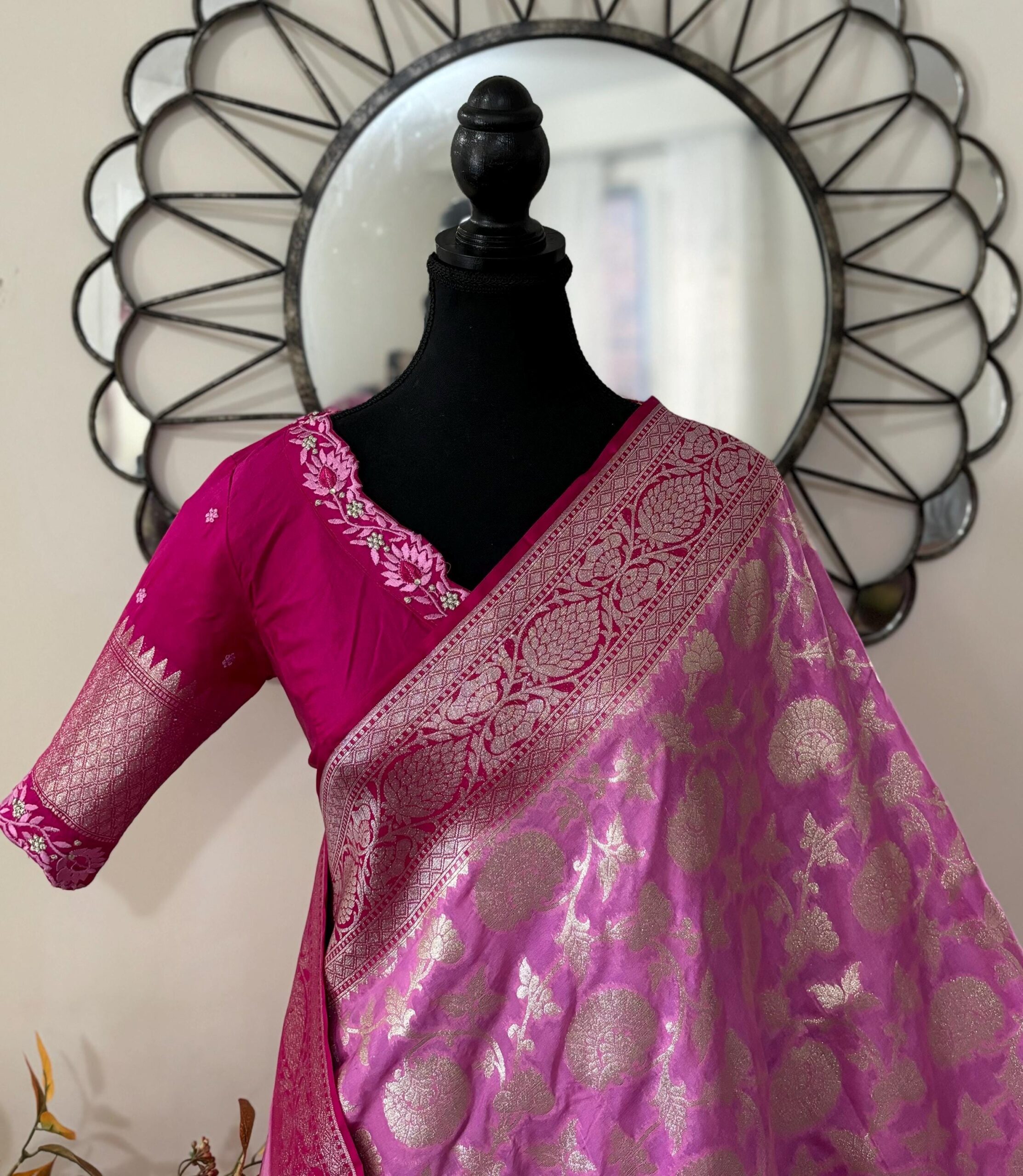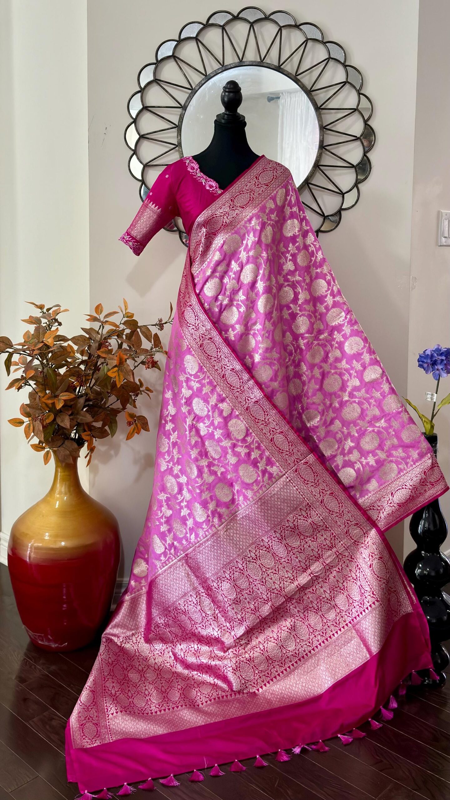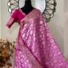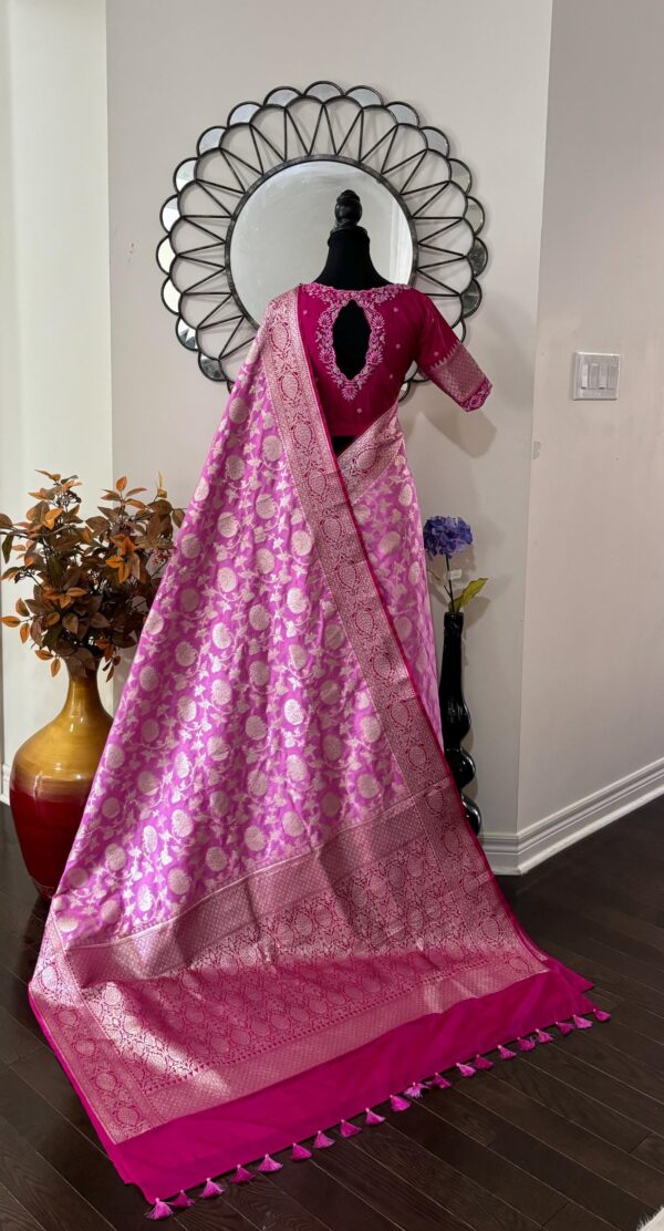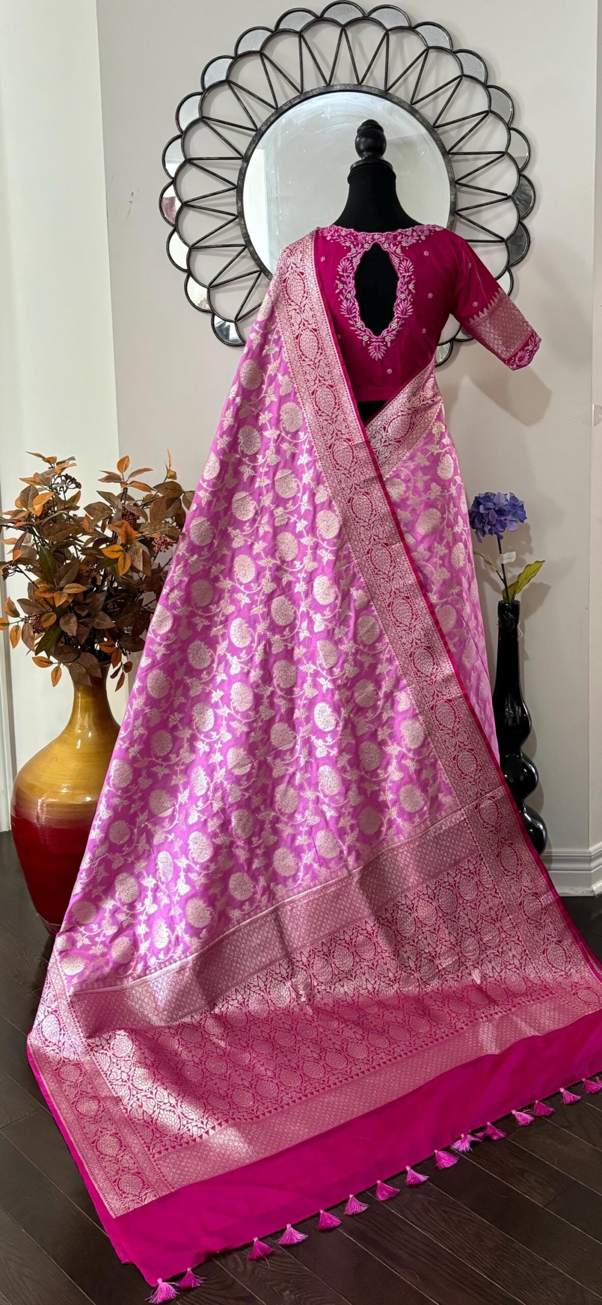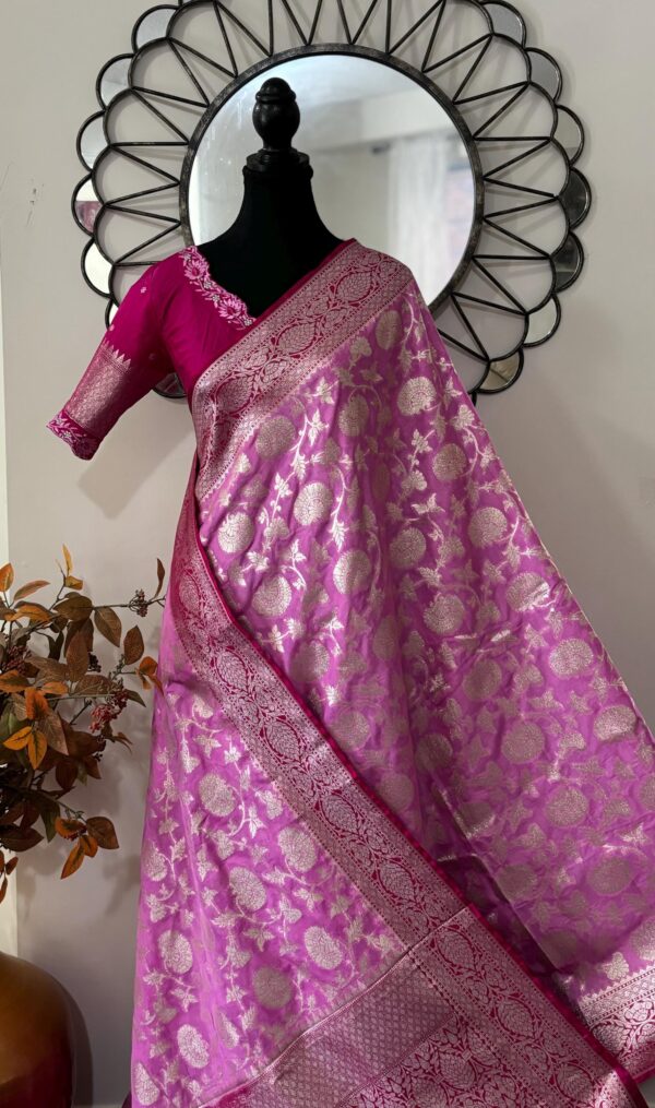 Beautiful banarasi silk saree paired up with beautiful embroidery blouse fits to 32 to 46 in beautiful rare colors all over the saree jaal
