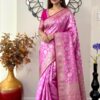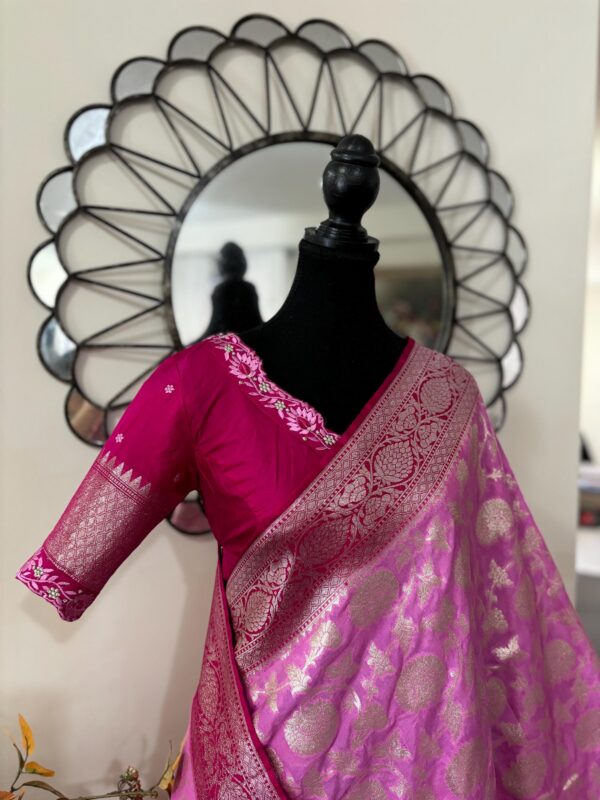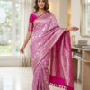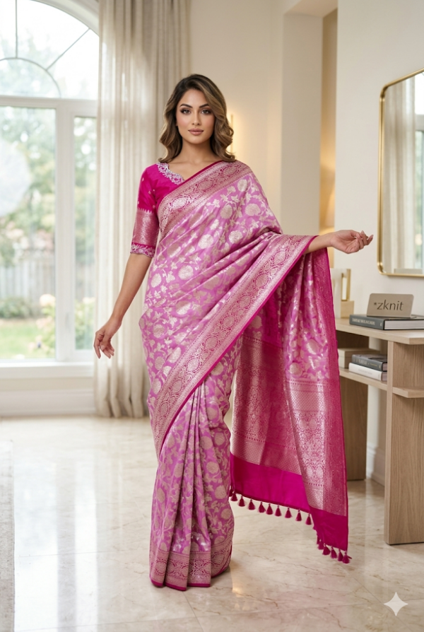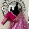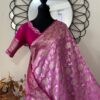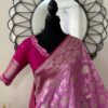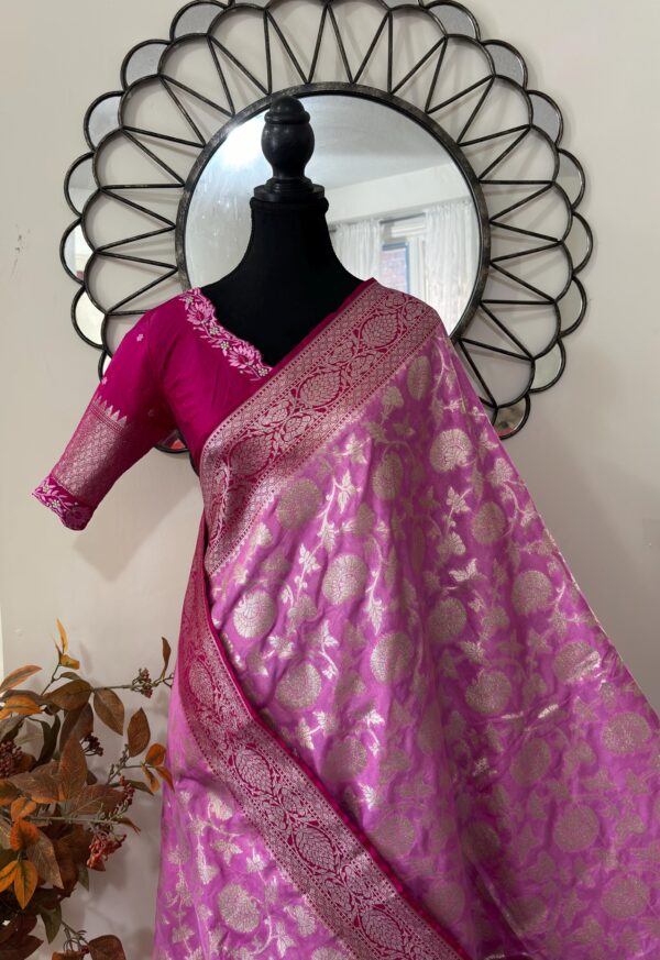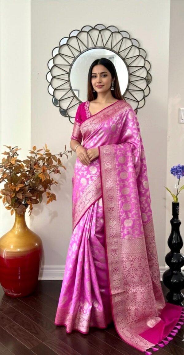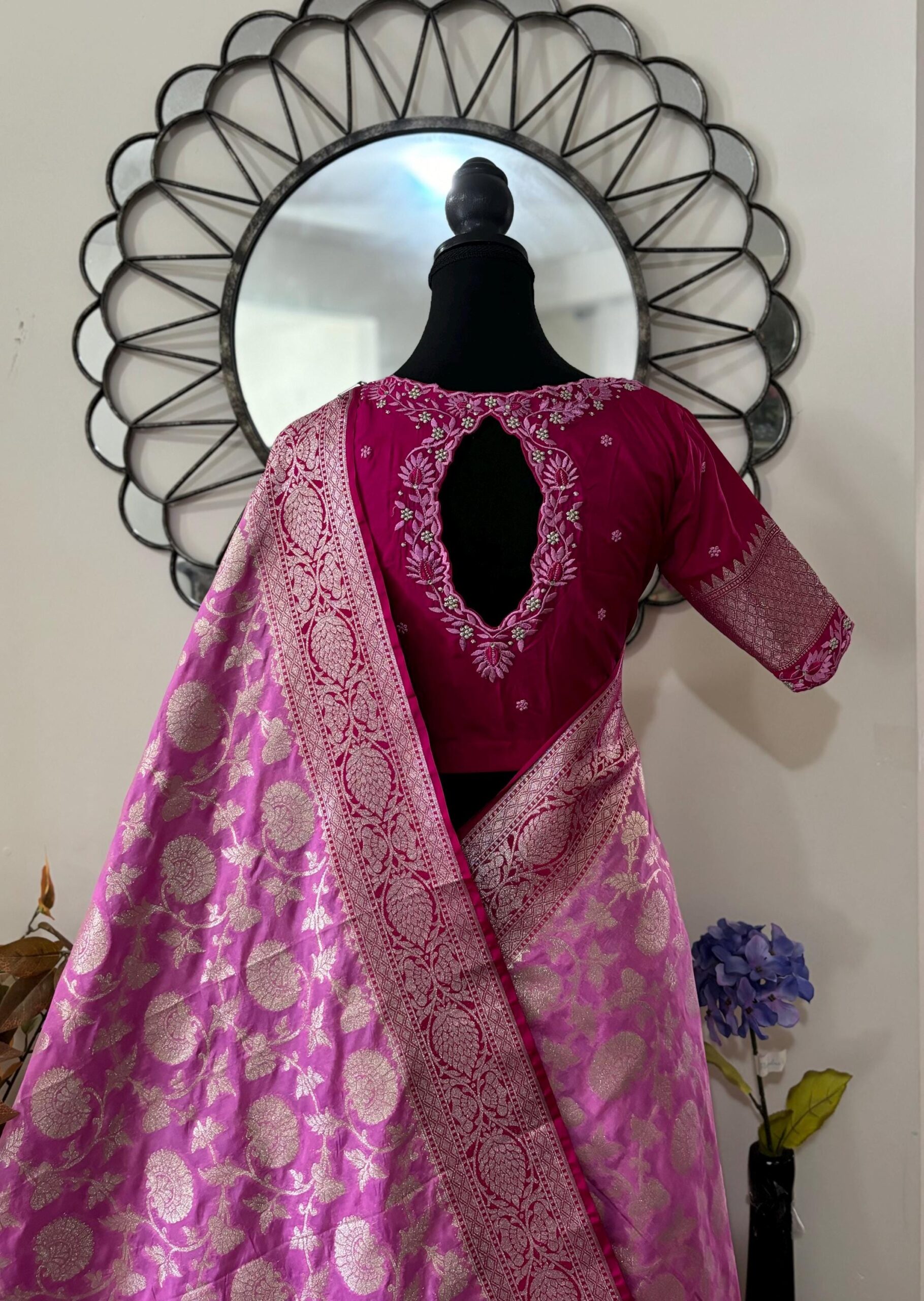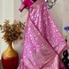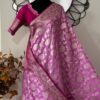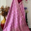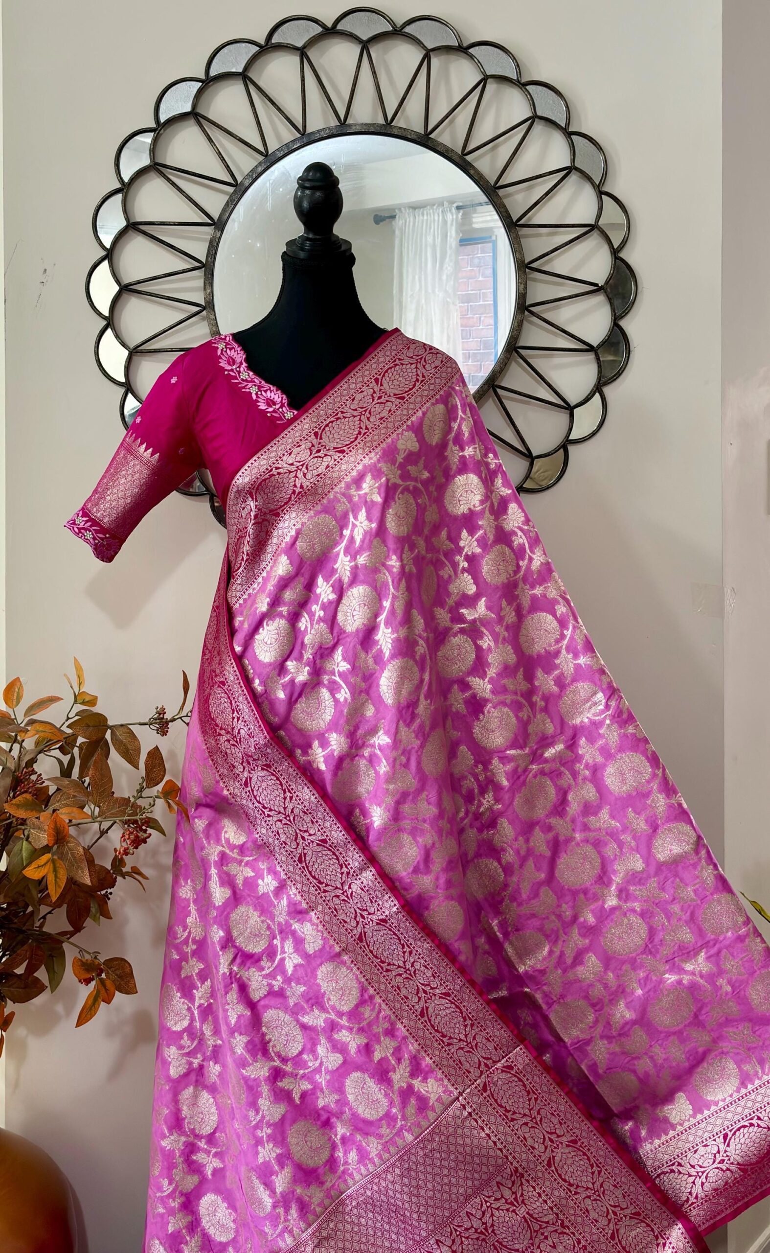 Beautiful banarasi silk saree paired up with beautiful embroidery blouse fits to 32 to 46 in beautiful rare colors all over the saree jaal
