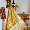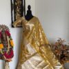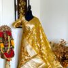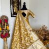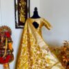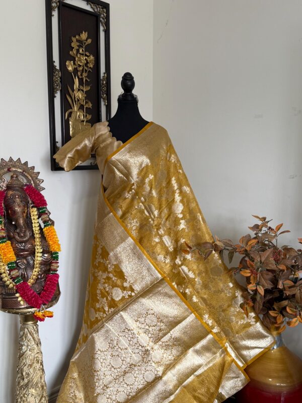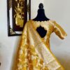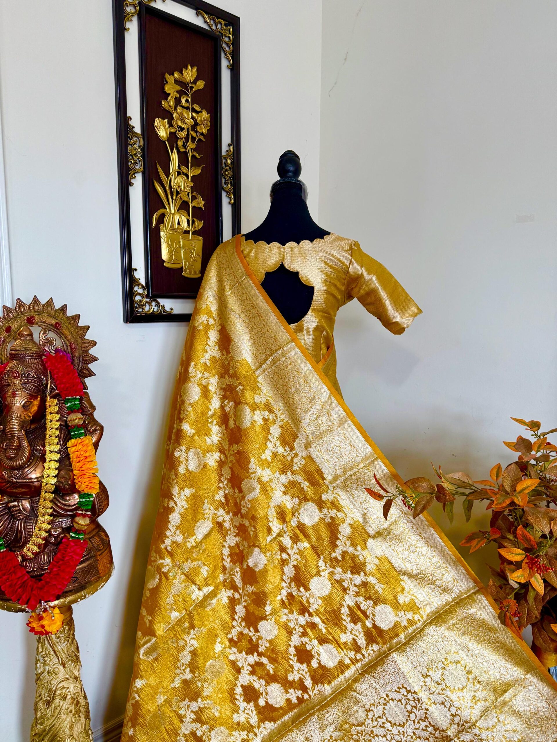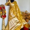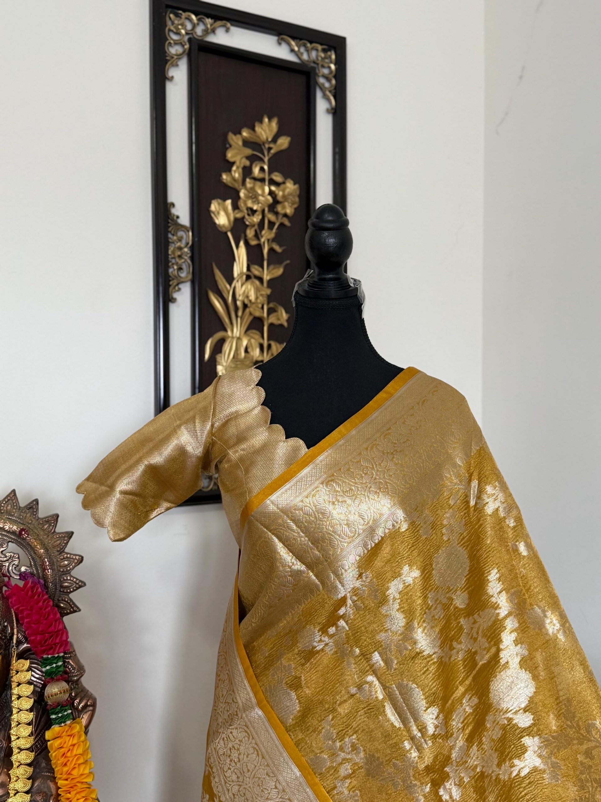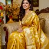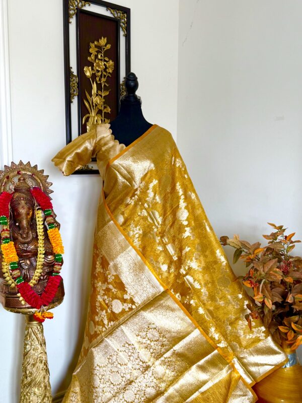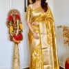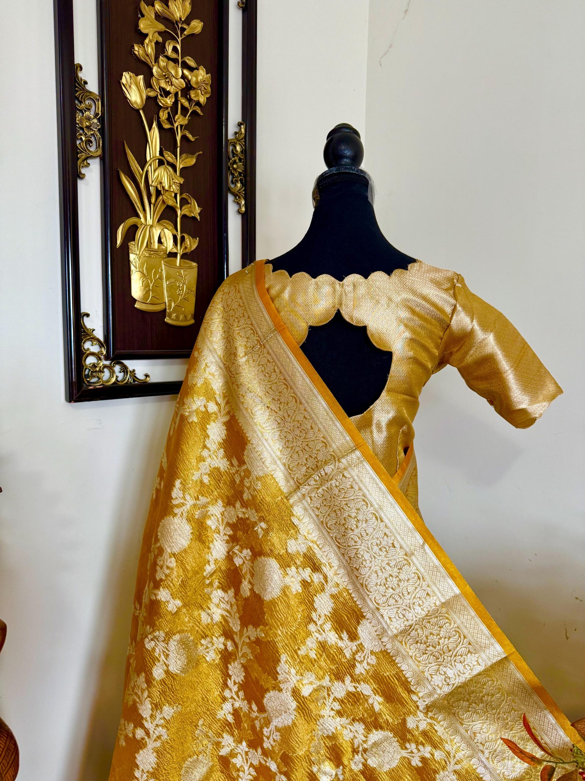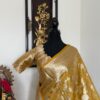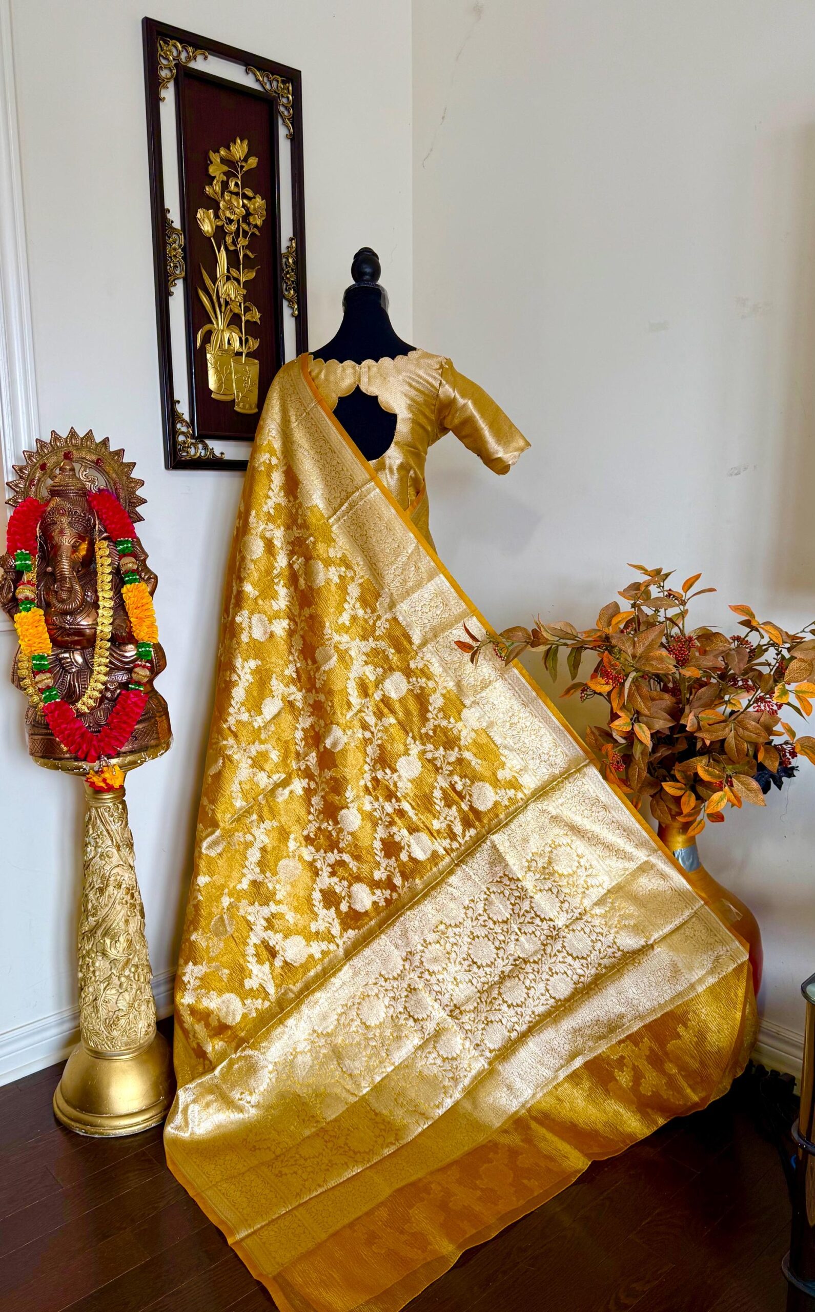 Beautiful gold color light weight party wear cocktail pure silk crush tissue saree paired up with pretty designer Blouse fits 32-46/contact seller for availabil