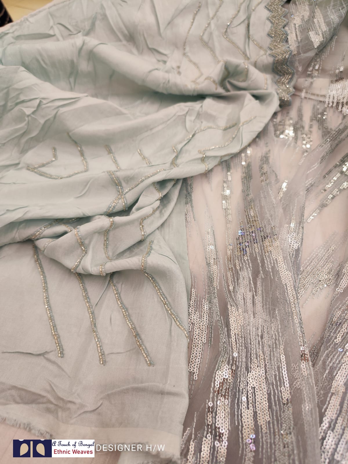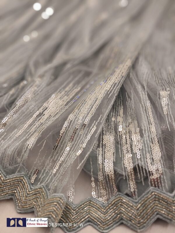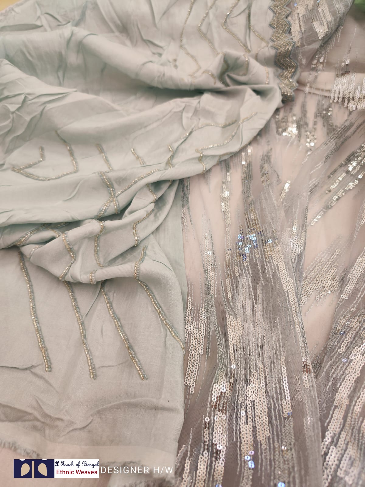 The upper body is super-soft net with fully loaded heavy sequins and the lower body is pure crepe silk with cutdana work.
