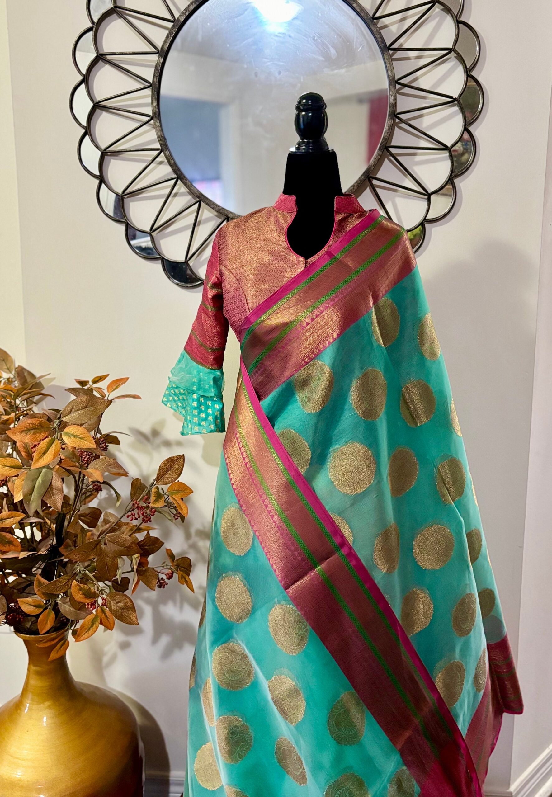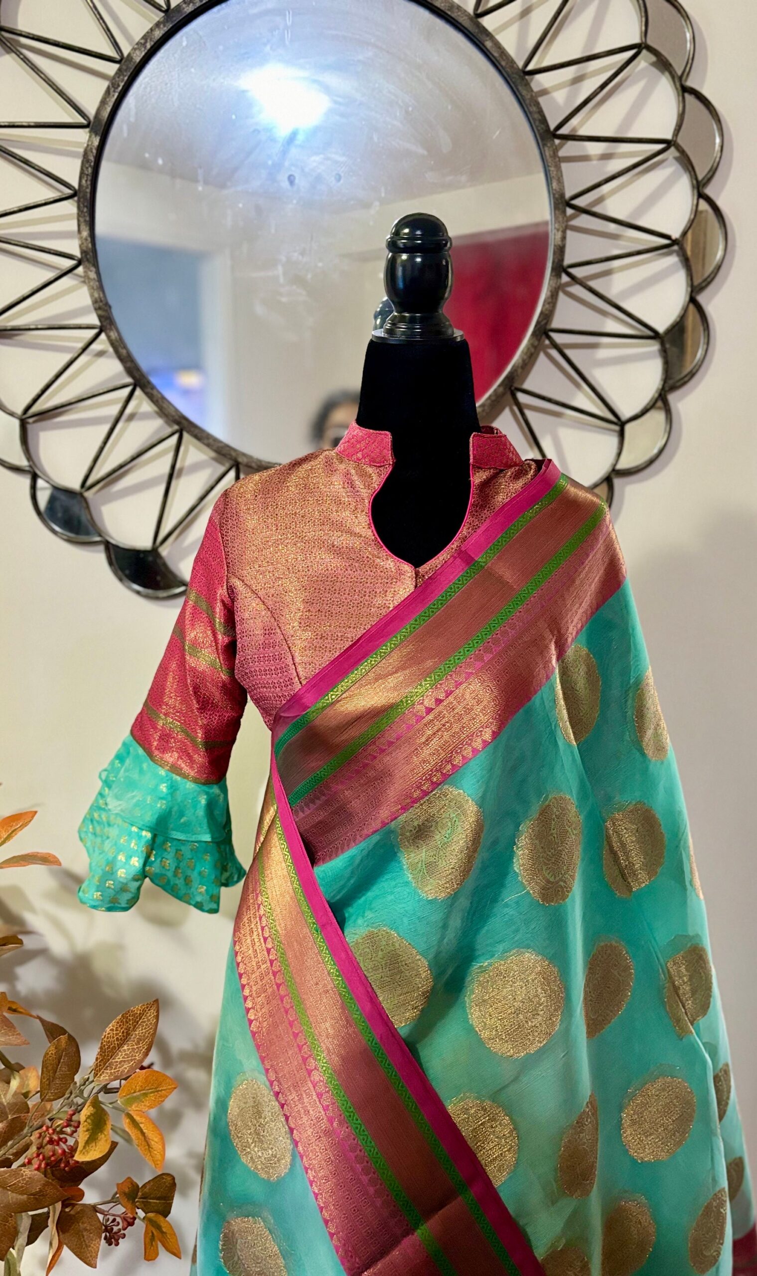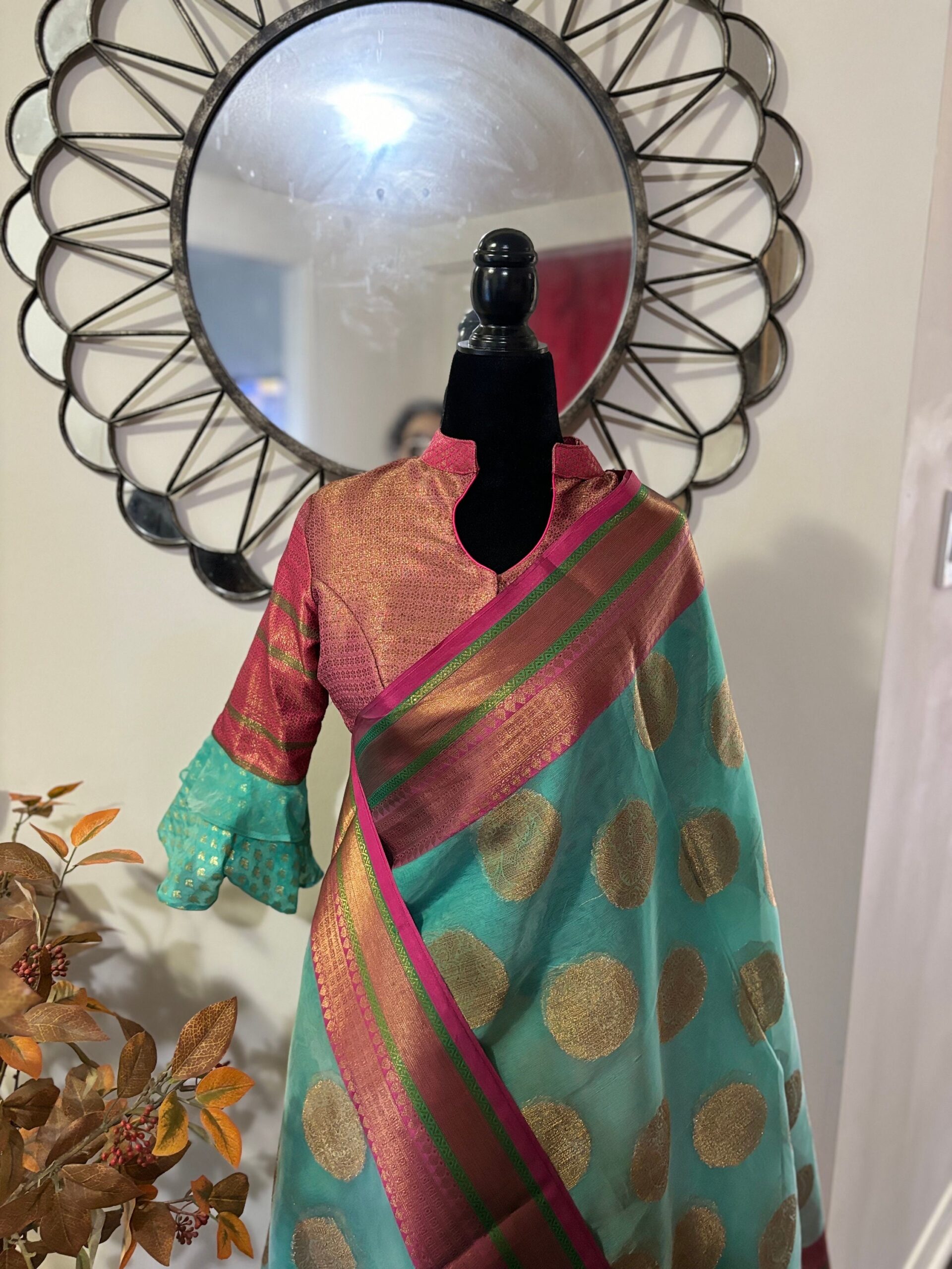paired up with ready to wear pretty designer blouse fits to 32 to 44 size