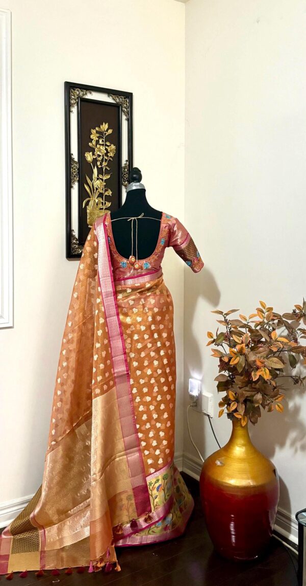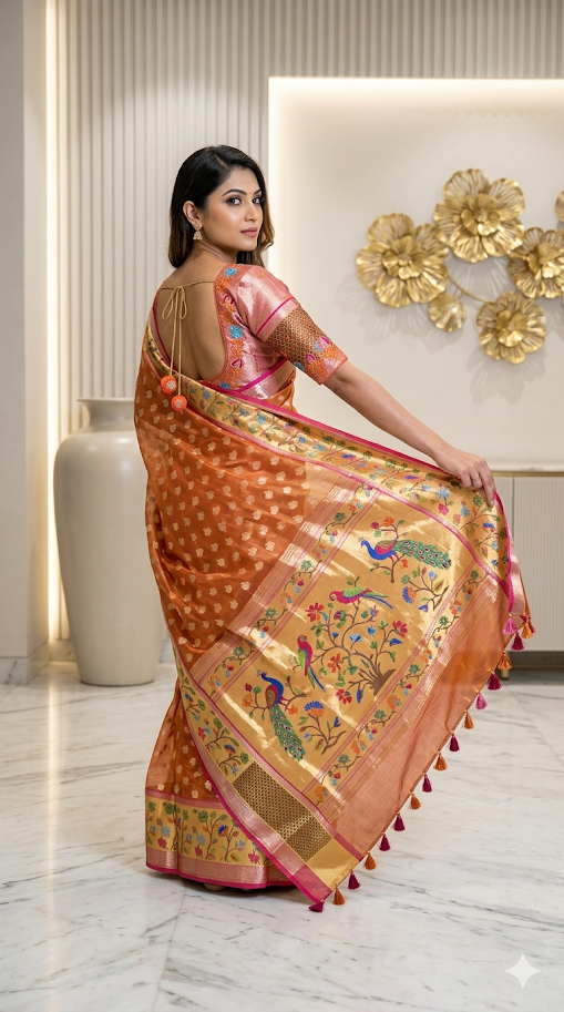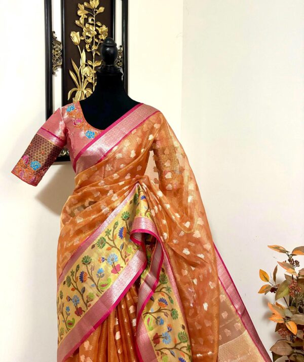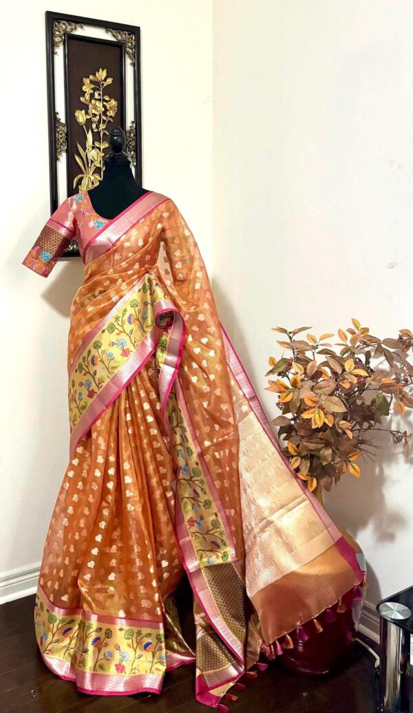 💥💥💥 Exclusive designer Orange Tissue Pure Silk Zari Kota Silk saree with Pythani Paithani border Beautiful light weight zari Kota saree with pythani Zari boardes and beautiful peacocks on boarder all over the saree in beautiful Zari pythani floral boarder the Zari motifs all over the saree is in beautiful saree very light weight on you!