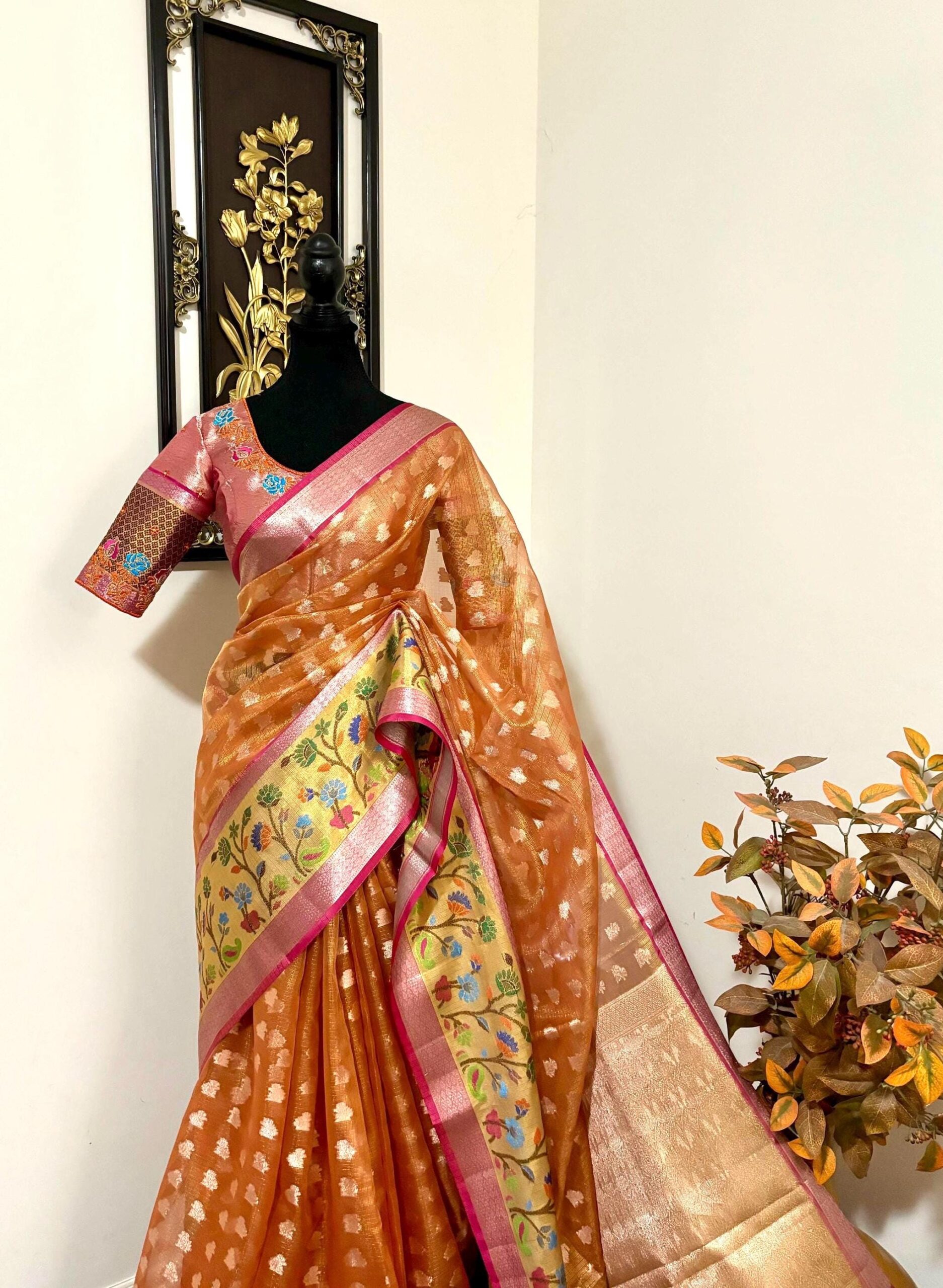 💥💥💥 Exclusive designer Orange Tissue Pure Silk Zari Kota Silk saree with Pythani Paithani border Beautiful light weight zari Kota saree with pythani Zari boardes and beautiful peacocks on boarder all over the saree in beautiful Zari pythani floral boarder the Zari motifs all over the saree is in beautiful saree very light weight on you!