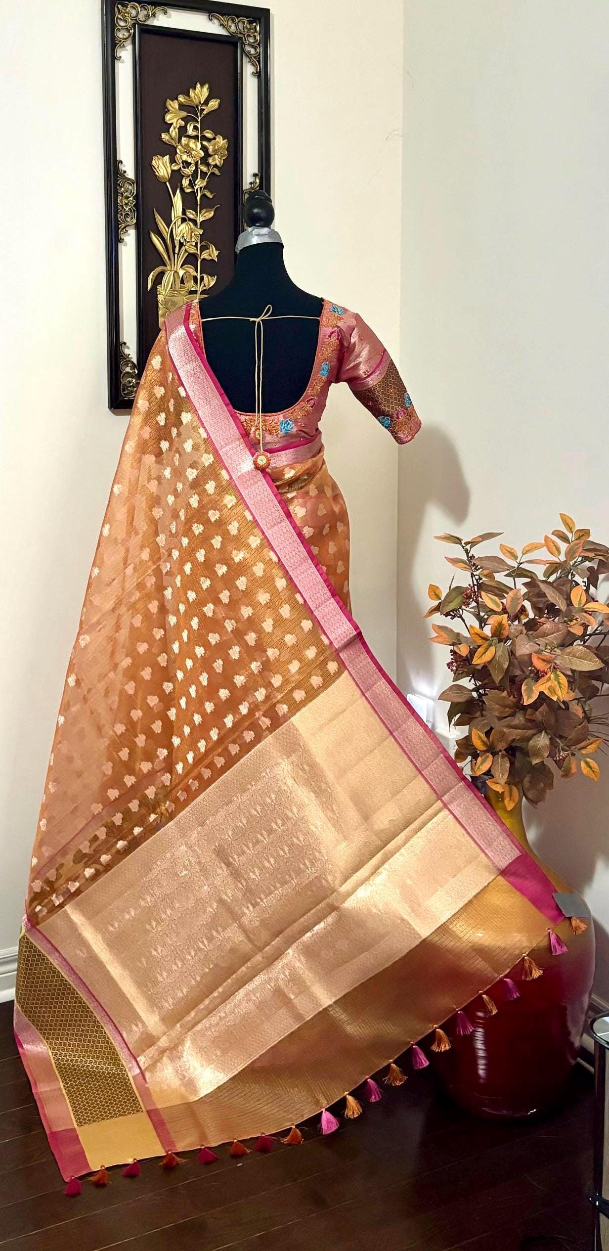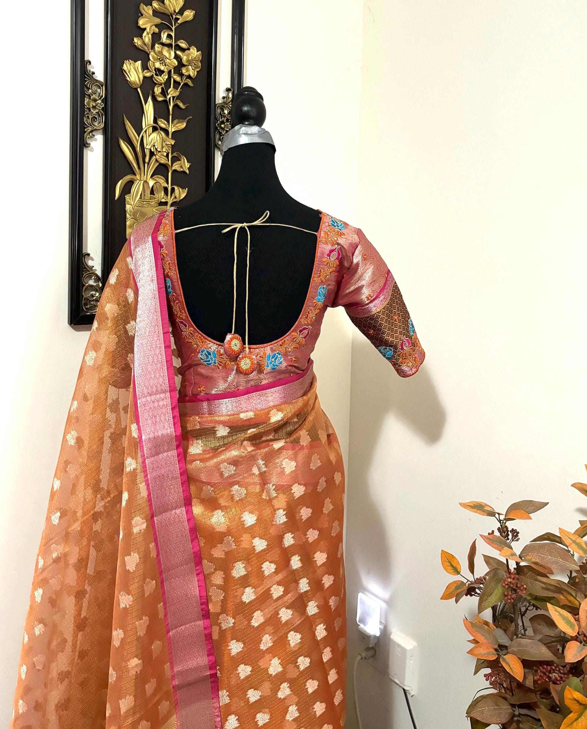 Embrace effortless elegance with this beautiful Peach-Orange Zari Kota Saree. Perfect for festivities, weddings, or formal gatherings, this saree combines traditional craftsmanship with modern convenience. The lightweight Kota fabric offers a soft, sheer texture that drapes beautifully and stays comfortable all day long.