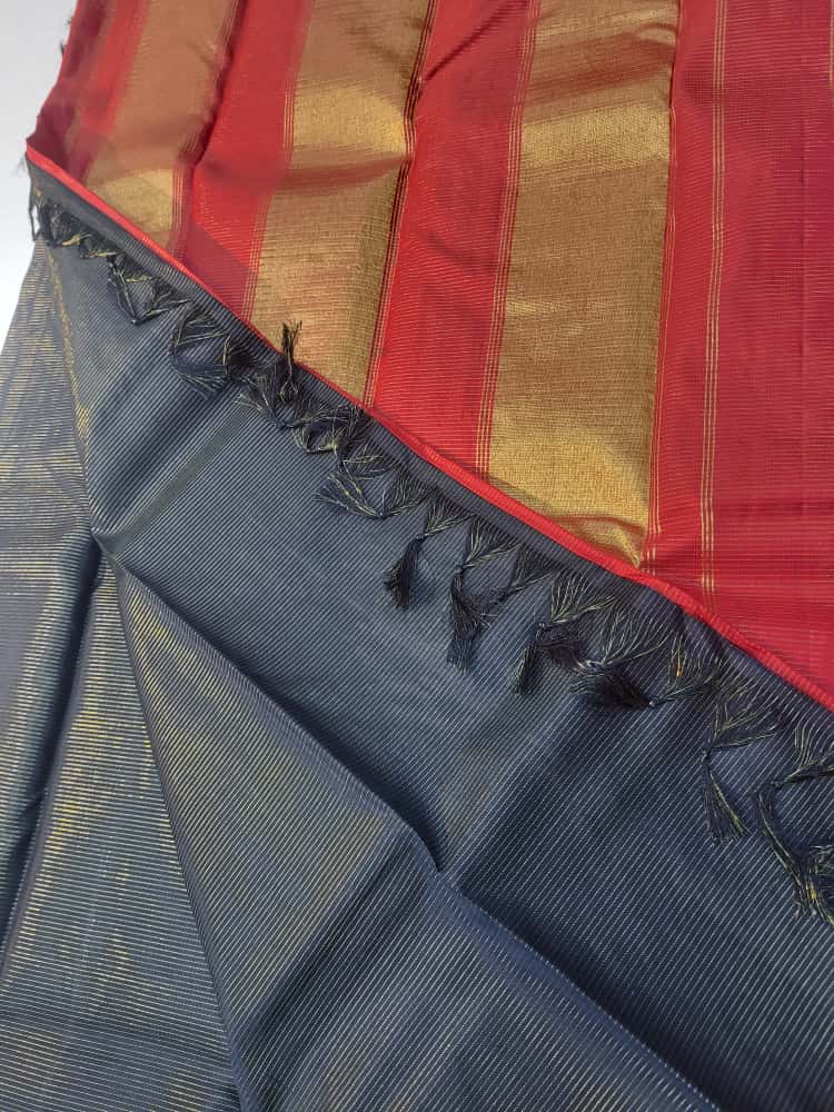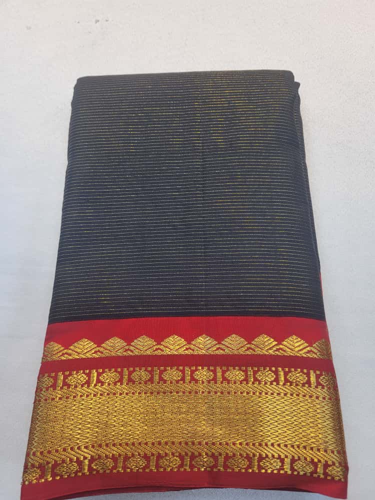 This stunning black Kanjeevaram saree is a timeless piece crafted from premium silk, known for its luxurious texture and durability. The deep black body is beautifully contrasted with intricate gold zari work along the borders and pallu, featuring traditional South Indian motifs like peacocks, paisleys, and floral vines. Handwoven in the heart of Tamil Nadu, this saree reflects the heritage of Kanjeevaram craftsmanship. Ideal for grand celebrations, weddings, or festive occasions, it pairs gracefully with traditional gold jewelry to complete a regal look.