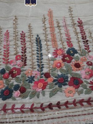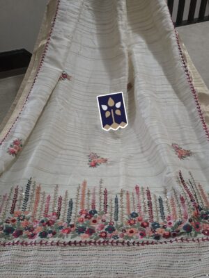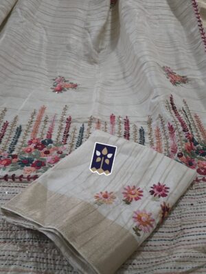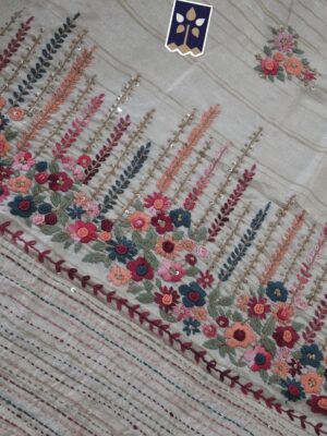 - Crafted from premium Georgette silk, the saree has a characteristic rich texture