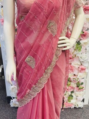 - Crafted from premium Georgette silk, the saree has a characteristic rich texture