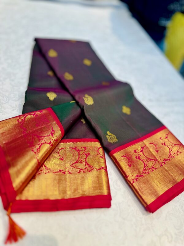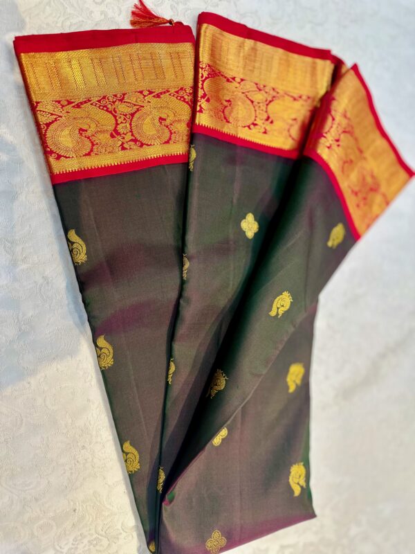 Exclusive Korvai Kanjeevaram or Kanjivaram – Elegant Dual Tone Olive body and Red and Gold border and Pallu and gold motif work all over the saree. Based on design from Kanchipuram