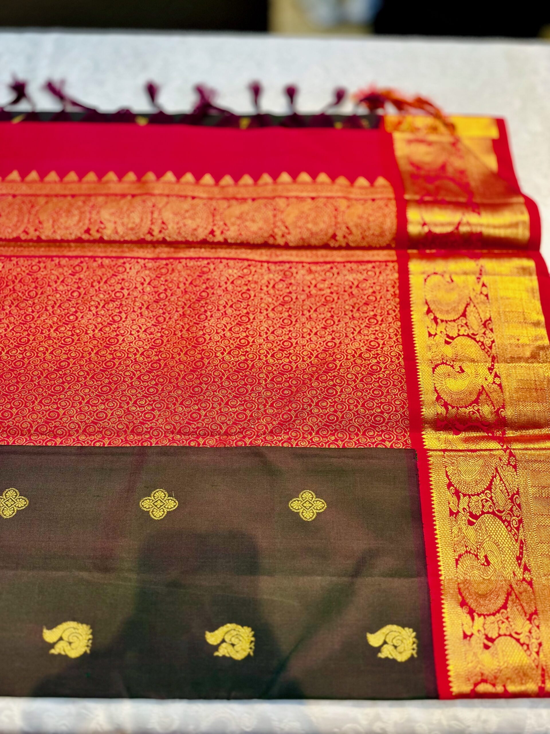 Exclusive Korvai Kanjeevaram or Kanjivaram – Elegant Dual Tone Olive body and Red and Gold border and Pallu and gold motif work all over the saree. Based on design from Kanchipuram