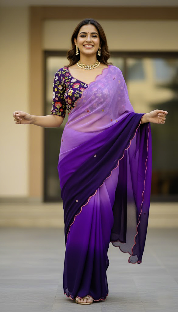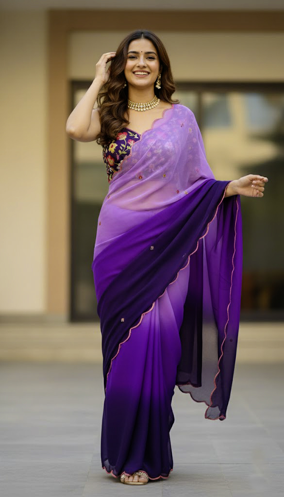 Drape yourself in the magical hues of a sunset with our Ethereal Twilight Ombré Saree. Crafted from luxuriously soft and flowy georgette, this saree features a stunning gradient that cascades from a delicate lavender to a deep, majestic violet. Paired with a richly embroidered unstitched blouse piece, this ensemble is a masterpiece of modern elegance and traditional charm, perfect for making a sophisticated statement.