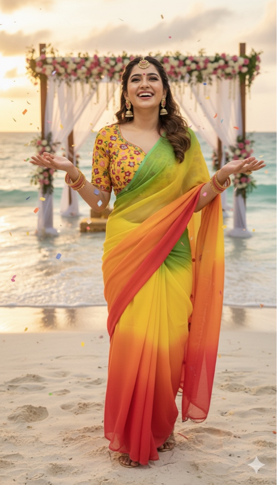 Step into the spotlight with a saree that’s as unique as you are. Our “Ethereal Twilight” saree captures the breathtaking beauty of a transitioning sky. The premium georgette fabric feels gentle against the skin and drapes effortlessly, creating a flattering silhouette for any body type.