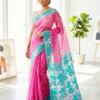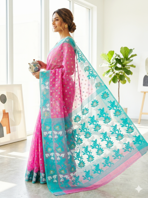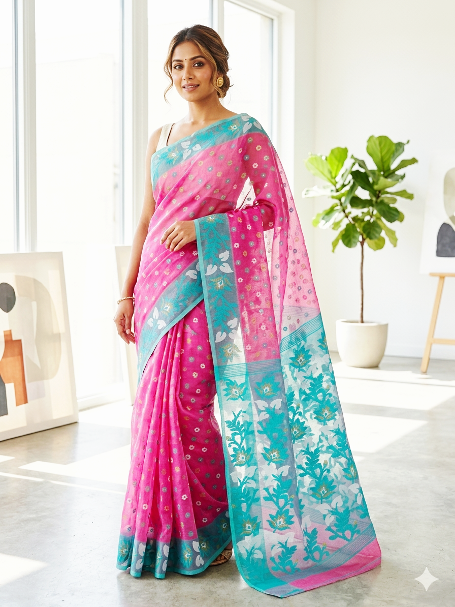 Elevate your ethnic wardrobe with this masterpiece of Bengal craftsmanship. This hand-woven Dhakai Jamdani features a vibrant fuchsia pink body adorned with delicate floral butis and a stunning turquoise-silver border.
