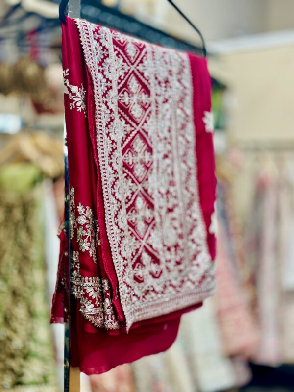 This captivating red saree embodies timeless grandeur with its rich color and elaborate craftsmanship. The highlight of the ensemble is its beautifully designed heavy palla, adorned with intricate golden zari embroidery that adds a luxurious sheen. Delicate motifs and traditional patterns run through the fabric, showcasing exquisite artistry and attention to detail. Crafted from a lustrous material that drapes elegantly, this saree is perfect for weddings, festive occasions, or grand celebrations — a true statement piece that reflects traditional Indian opulence.