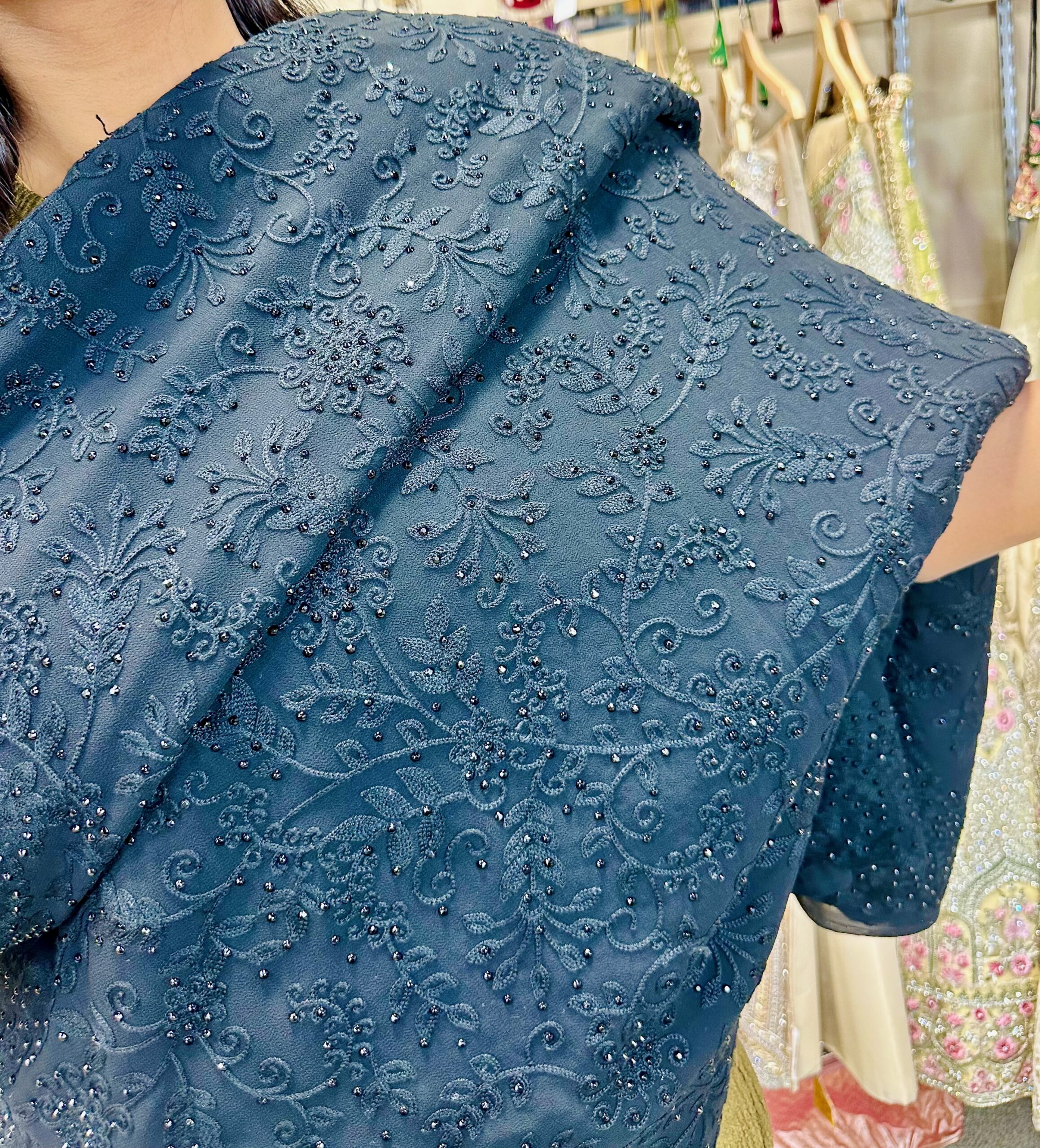 Elevate your ethnic elegance with this stunning Teal Embroidery Work Saree, designed to blend traditional charm with modern sophistication. Crafted from premium fabric, the saree showcases intricate embroidery detailing across the border and pallu, featuring floral and paisley motifs in complementary shades. The rich teal base adds depth and grace, making it perfect for festive occasions, weddings, or special celebrations. Paired with a matching embroidered blouse, this saree is a timeless addition to any wardrobe.