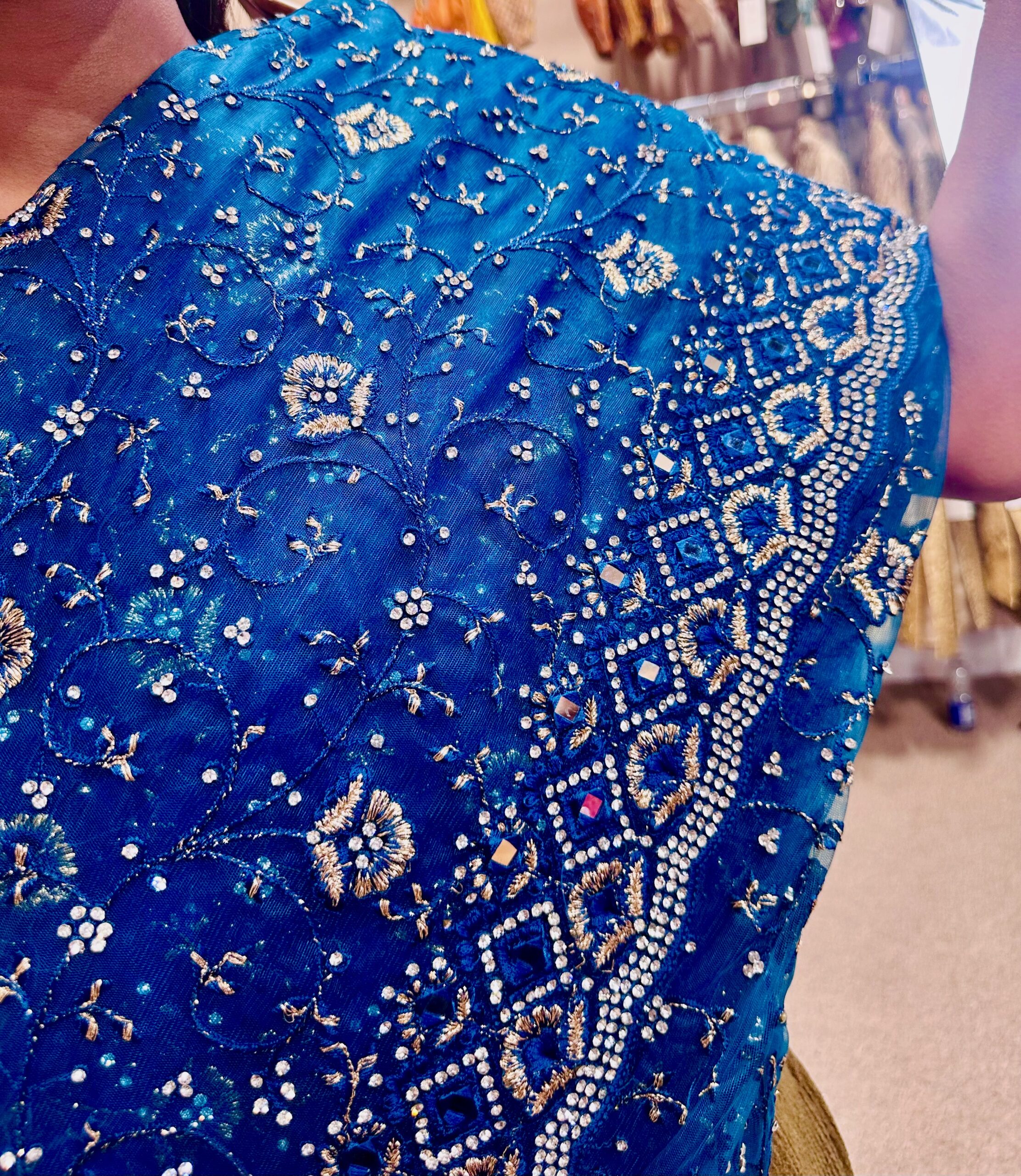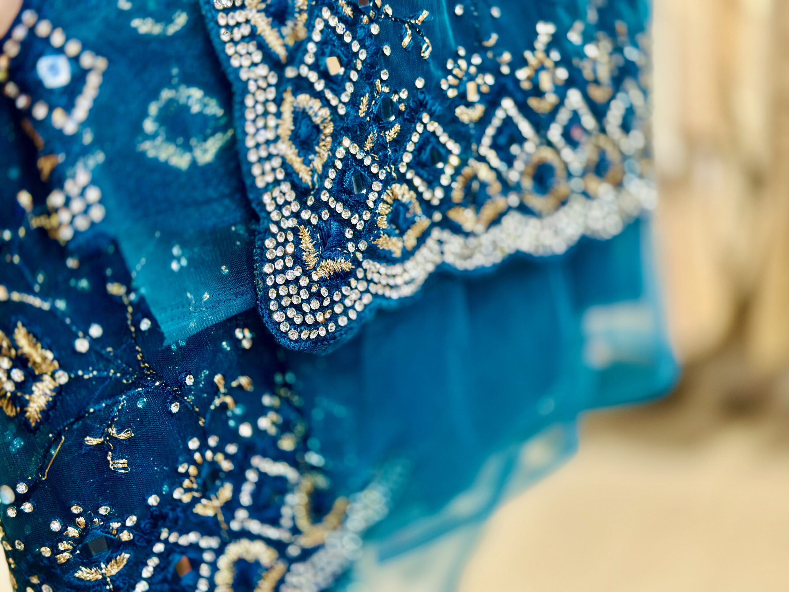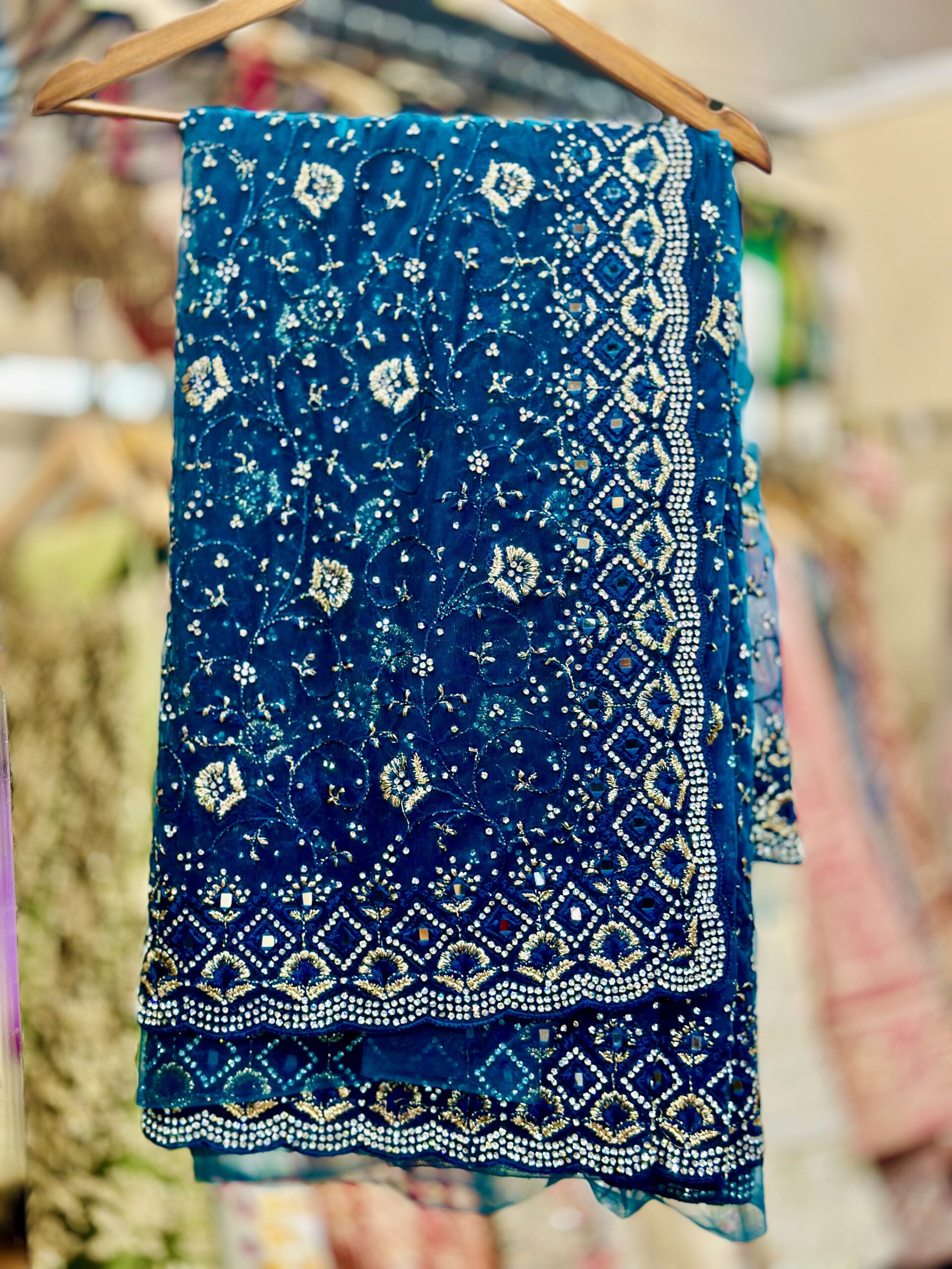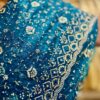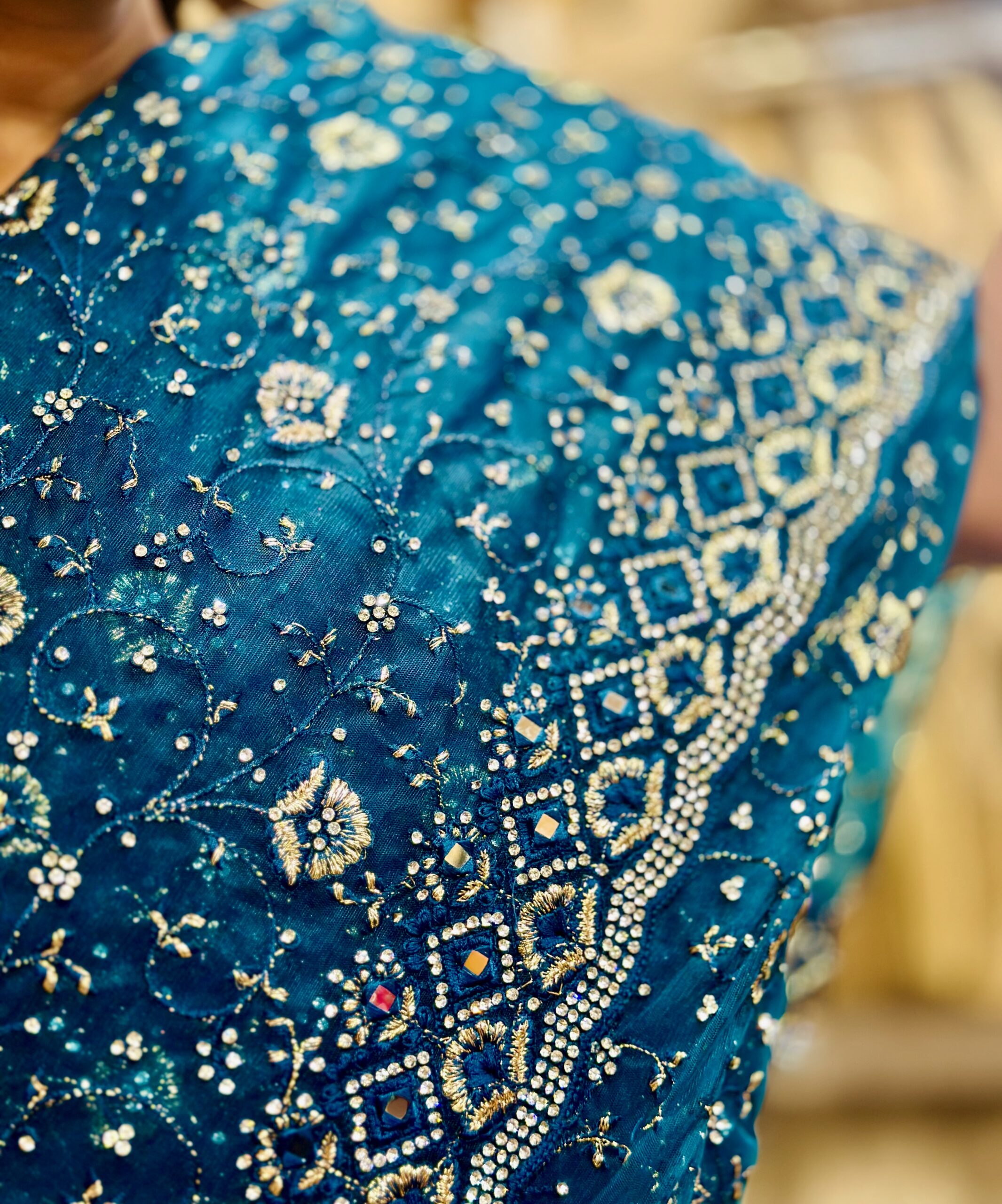 Drape yourself in sheer elegance with this Glittery Teal Blue Georgette Saree, a perfect blend of glamour and tradition. Crafted from lightweight georgette, the saree features a subtle shimmer that catches the light beautifully, adding a touch of sparkle to your look. The striking gold embroidered border and delicate floral motifs elevate its charm, making it ideal for weddings, receptions, or festive evenings. Paired with a complementing blouse, this saree ensures you stand out with effortless grace.